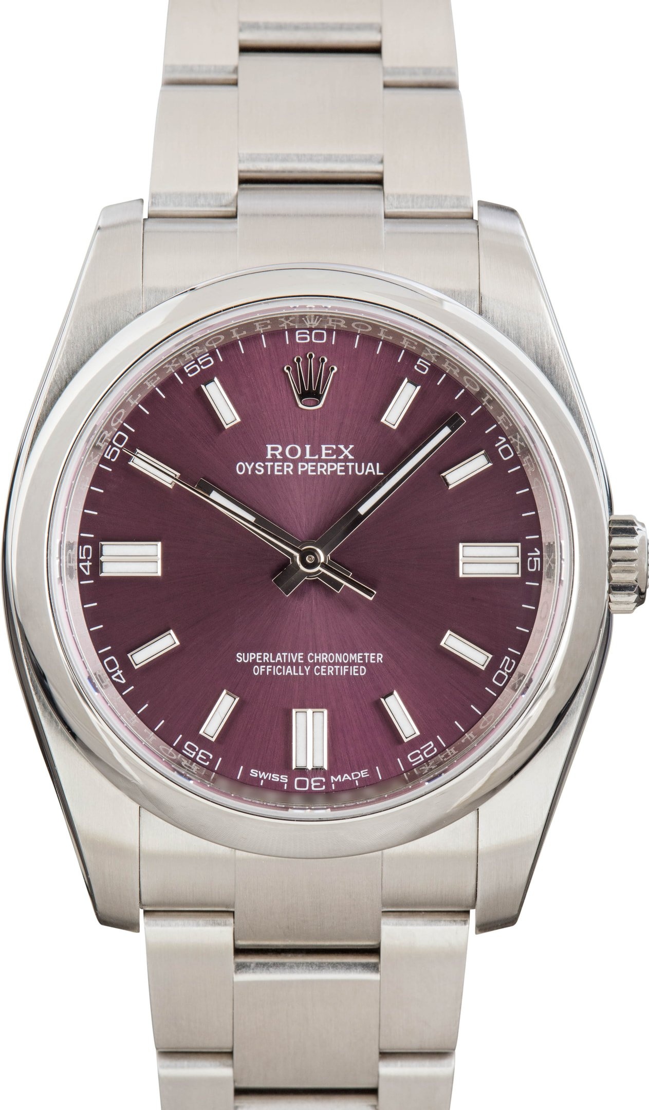 Why We Love This Watch This Rolex Oyster Perpetual ref 116000 (2017) features a 36mm stainless steel case with a smooth bezel, showcasing a vibrant red grape dial with luminous index hour markers. Paired with a stainless steel Oyster bracelet and powered by the reliable Caliber 3130, this model combines bold color with Rolex’s signature precision, durability, and clean, timeless design. WATCH DETAILS CREDIT CARD PRICE $8,226.86 BRAND Rolex MODEL NAME Oyster Perpetual 36 MODEL NUMBER 116000 YEAR 2017 ITEM NUMBER 172255 CONDITION Excellent GENDER Mens Unisex BOX & PAPERS Box and Papers CASE MATERIAL Stainless Steel CRYSTAL Sapphire SIZE 36MM BEZEL Stainless Steel Smooth SERIAL Y9318XXX DIAL Red w/ Index hour markers, Superluminova hands & Superluminova lume MOVEMENT CALIBRE 3130 TYPE Automatic BEZEL Fixed COMPLICATION No Date BRACELET MATERIAL Stainless Steel TYPE Oyster CLASP Oysterclasp