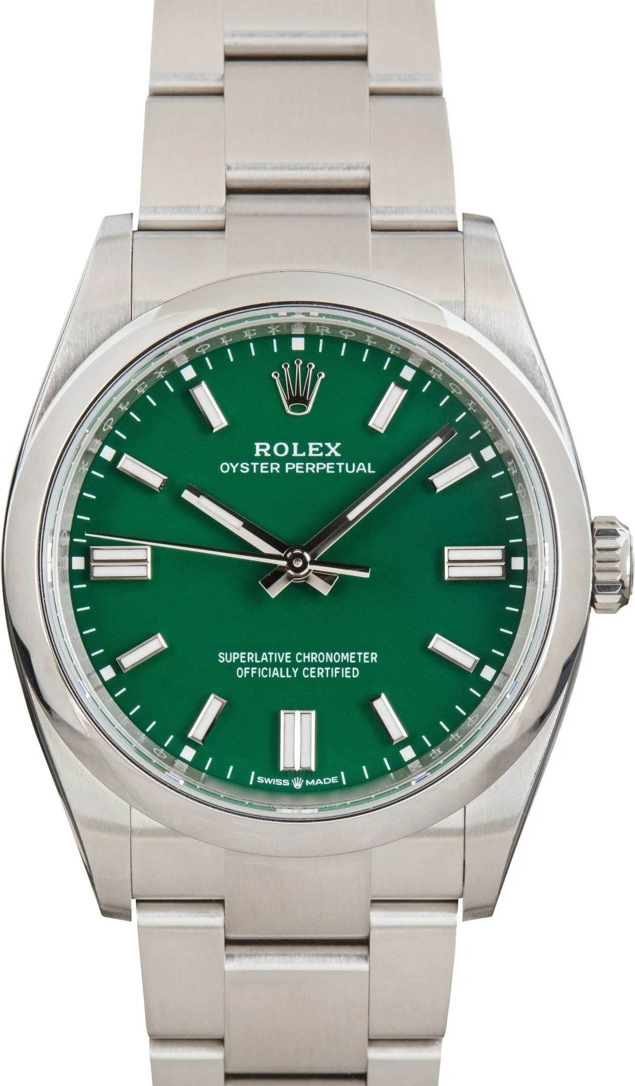 Why We Love This Watch This pre-owned Rolex Oyster Perpetual ref. 126000 (2022) offers a vibrant update on a classic design. This 36mm stainless steel case is paired with a smooth polished bezel and a striking green dial featuring luminous index hour markers for enhanced legibility. Powered by Rolex’s Caliber 3230, this timepiece delivers exceptional precision, anti-magnetic performance, and a 70-hour power reserve. Completed with a stainless steel Oyster bracelet, this Oyster Perpetual combines modern reliability with clean, timeless styling. WATCH DETAILS CREDIT CARD PRICE $10,902.26 BRAND Rolex MODEL NAME Oyster Perpetual 36 COLLECTION Oyster Perpetual MODEL NUMBER 126000 YEAR 2022 ITEM NUMBER 184258 CONDITION Excellent GENDER Mens Unisex BOX & PAPERS Box and Papers CASE MATERIAL Stainless Steel CRYSTAL Sapphire SIZE 36MM BEZEL Stainless Steel Smooth CASEBACK Solid SERIAL 120S3XXX DIAL Green w/ Index hour markers, Chromalight hands & Chromalight lume MOVEMENT CALIBRE 3230 TYPE Automatic BEZEL Fixed COMPLICATION No Date BRACELET MATERIAL Stainless Steel TYPE Oyster CLASP Oysterclasp