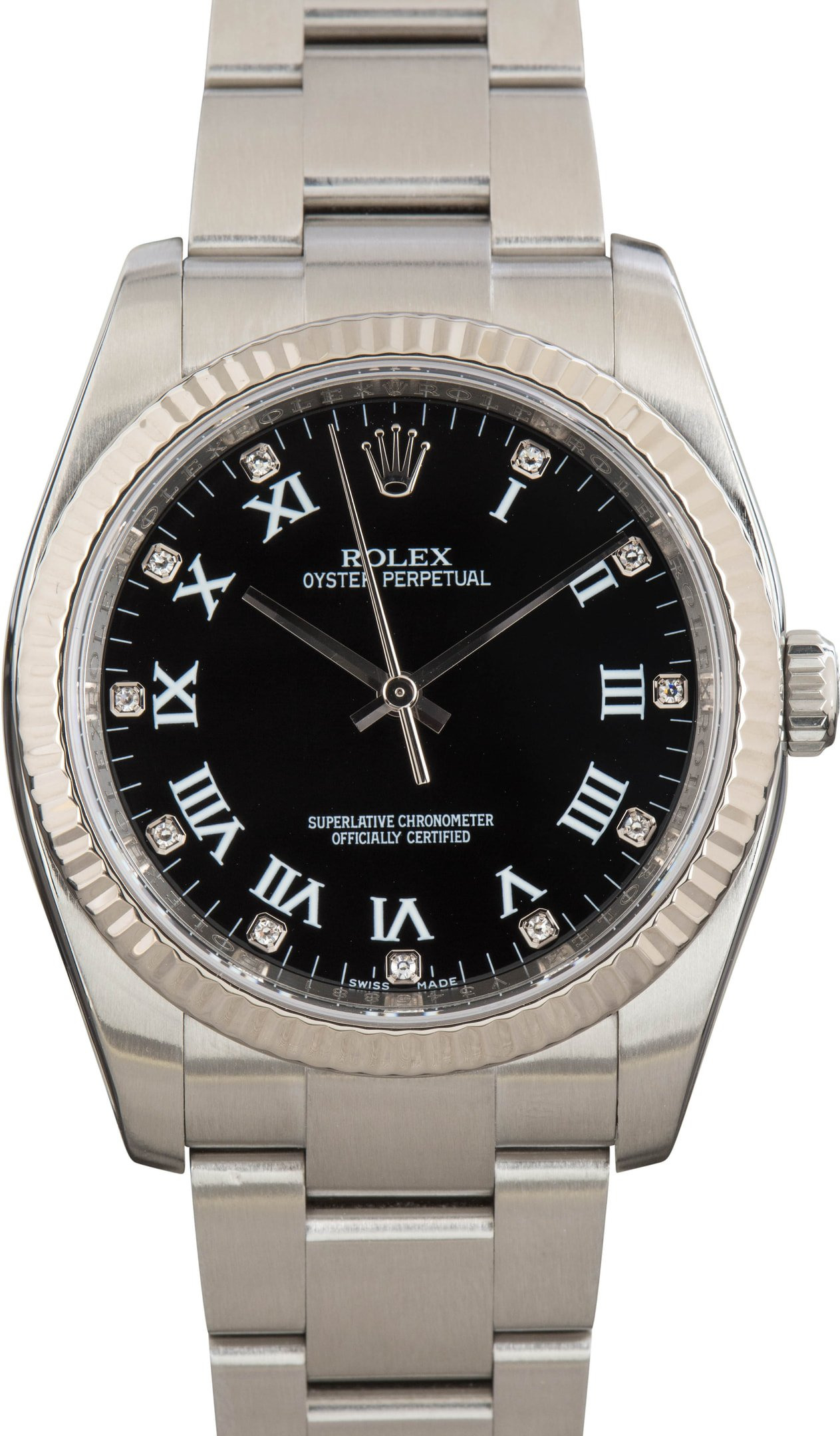 Why We Love This Watch This pre-owned Rolex Oyster Perpetual 36 ref. 116034 (2008–2009) combines classic elegance with refined detailing. The 36mm stainless steel case is paired with a striking black dial featuring a sophisticated mix of diamond and Roman numeral hour markers. An 18k white gold fluted bezel adds a touch of luxury, while the Oyster bracelet ensures comfort and timeless style. Powered by Rolex’s reliable Caliber 3130 automatic movement, this Oyster Perpetual delivers precision, durability, and enduring appeal. WATCH DETAILS CREDIT CARD PRICE $8,226.86 BRAND Rolex MODEL NAME Oyster Perpetual 36 COLLECTION Oyster Perpetual MODEL NUMBER 116034 YEAR 2009 ITEM NUMBER 181983 CONDITION Excellent GENDER Mens BOX & PAPERS No Box or Papers CASE MATERIAL Stainless Steel CRYSTAL Sapphire SIZE 36MM BEZEL 18k White Gold Fluted CASEBACK Solid SERIAL V345XXX DIAL Black Diamond w/ Roman hour markers, Nonluminous hands & Nonluminous lume MOVEMENT CALIBRE 3130 TYPE Automatic BEZEL Fixed COMPLICATION Date BRACELET MATERIAL Stainless Steel TYPE Oyster CLASP Oysterclasp