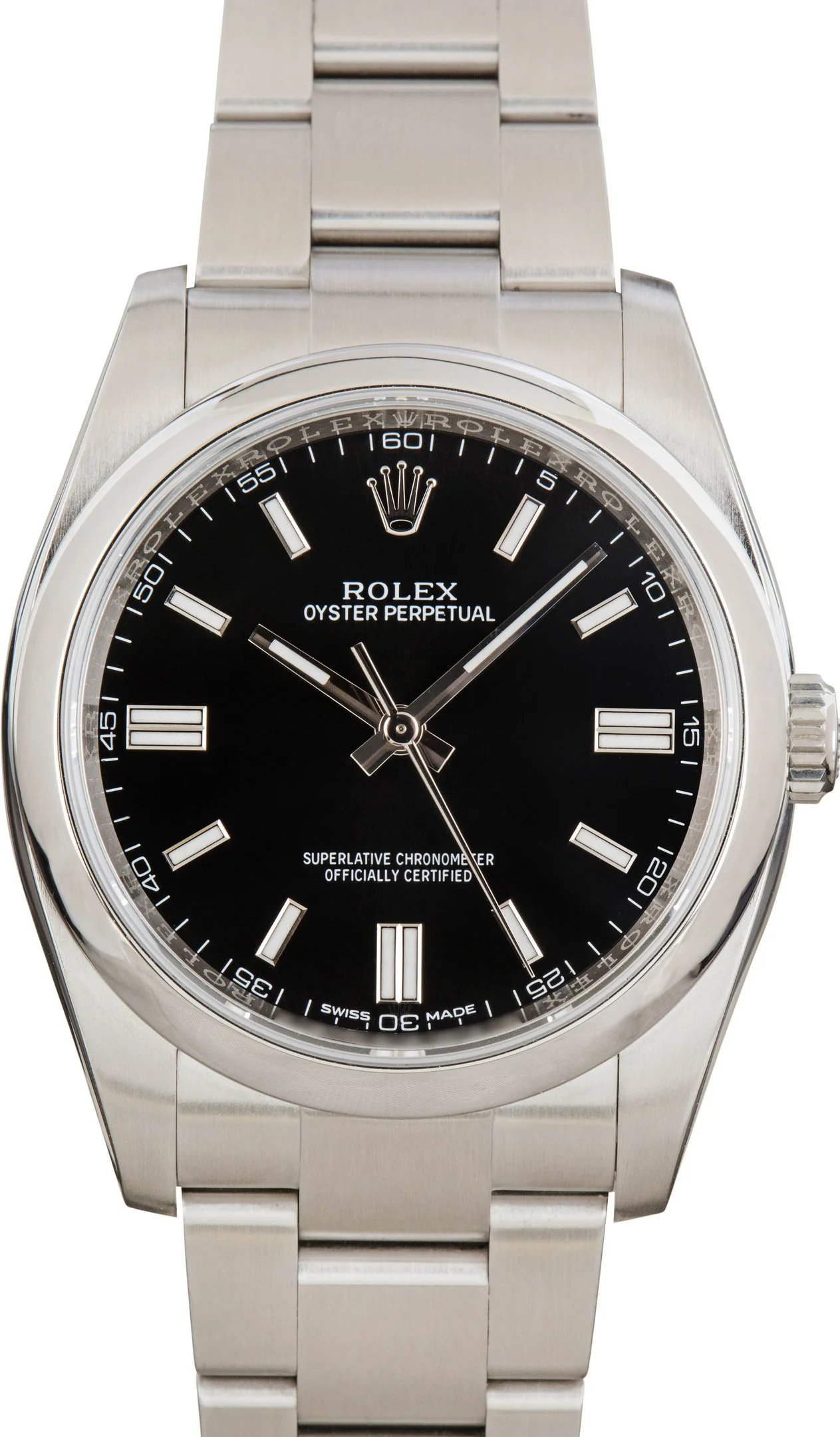 Why We Love This Watch This pre-owned Rolex Oyster Perpetual ref. 116000 (2020) features a 36mm stainless steel case with a smooth bezel and a black dial for a sleek, versatile look. The watch is powered by Rolex’s automatic Caliber 3130 movement, offering reliable precision and durability. With its classic design and robust Oyster construction, this Oyster Perpetual is an ideal everyday luxury timepiece. WATCH DETAILS BRAND Rolex MODEL NAME Oyster Perpetual 36 COLLECTION Oyster Perpetual MODEL NUMBER 116000 YEAR 2020 ITEM NUMBER 183708 CONDITION Excellent GENDER Mens Unisex BOX & PAPERS Box and Papers CASE MATERIAL Stainless Steel CRYSTAL Sapphire SIZE 36MM BEZEL Stainless Steel Smooth CASEBACK Solid SERIAL Q10Z5XXX DIAL Black w/ Index hour markers, Superluminova hands & Superluminova lume MOVEMENT CALIBRE 3130 TYPE Automatic BEZEL Fixed COMPLICATION No Date BRACELET MATERIAL Stainless Steel TYPE Oyster CLASP Oysterclasp