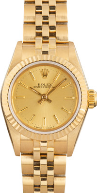 Why We Love This Watch Pre-owned Ladies Rolex Oyster Perpetual ref. 67198 (1985) radiates classic elegance in 18k yellow gold. Its 26mm case features a fluted bezel framing a warm champagne dial, paired with a distinctive honeycomb Jubilee bracelet. Powered by a precise self-winding movement, this Oyster Perpetual blends timeless style with everyday sophistication. WATCH DETAILS CREDIT CARD PRICE $9,255.86 BRAND Rolex MODEL NAME Oyster Perpetual 26 COLLECTION Oyster Perpetual MODEL NUMBER 67198 YEAR 1985 ITEM NUMBER 180769 CONDITION Excellent GENDER Womens BOX & PAPERS No Box or Papers CASE MATERIAL Yellow Gold CRYSTAL Sapphire SIZE 26MM BEZEL 18k Yellow Gold Fluted CASEBACK Solid SERIAL 8653XXX DIAL Champagne w/ Index hour markers, Tritium hands & Tritium lume MOVEMENT CALIBRE 2130 TYPE Automatic BEZEL Fixed COMPLICATION No Date BRACELET MATERIAL Yellow Gold TYPE Jubilee CLASP Oysterclasp