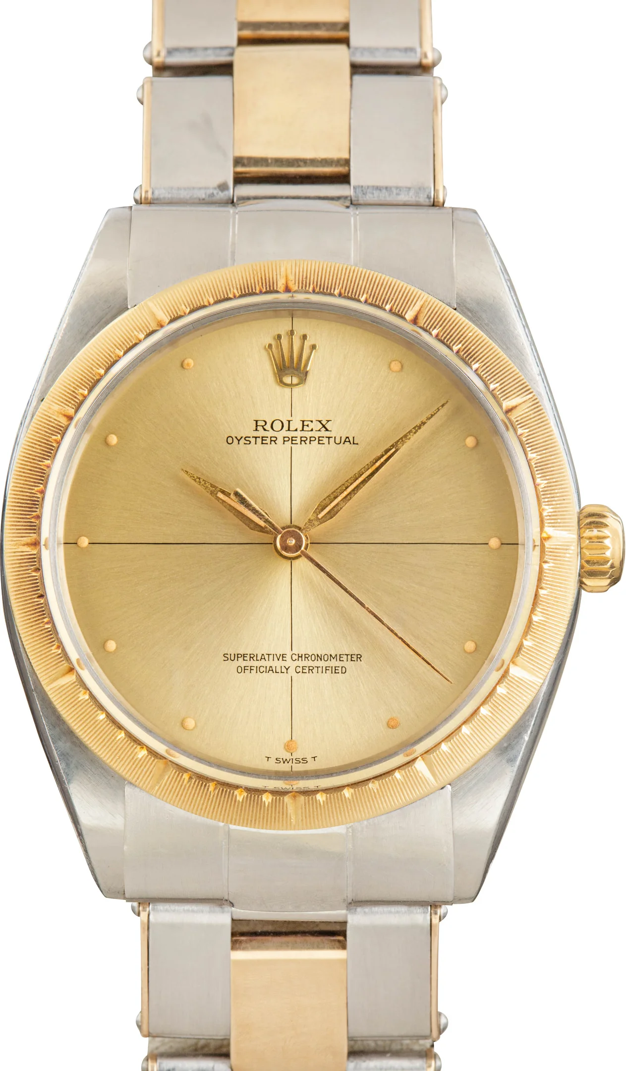 Why We Love This Watch This vintage Rolex Oyster Perpetual ref. 1008, dating to the early 1960s, embodies the understated sophistication of vintage Rolex design. Its champagne quadrant dial and crisply engine-turned bezel highlight the nuanced detailing of the era, while the 34mm yellow gold case maintains the timeless proportions collectors appreciate. Driven by a classic automatic Rolex caliber, this reference stands as an elegant example of the brand’s mid-century craftsmanship and enduring aesthetic. WATCH DETAILS CREDIT CARD PRICE $7,712.36 BRAND Rolex MODEL NAME Oyster Perpetual 34 COLLECTION Oyster Perpetual MODEL NUMBER 1008 YEAR Circa 1965 ITEM NUMBER 183884 CONDITION Vintage GENDER Mens Unisex BOX & PAPERS Box and Papers CASE MATERIAL Steel and Gold CRYSTAL Acrylic SIZE 34MM BEZEL 14k Yellow Gold Engine Turned CASEBACK Solid SERIAL 1165XXX DIAL Champagne w/ No Numerals hour markers, Tritium hands & Tritium lume MOVEMENT TYPE Automatic BEZEL Fixed COMPLICATION No Date BRACELET MATERIAL Two-Tone TYPE Oyster Rivet