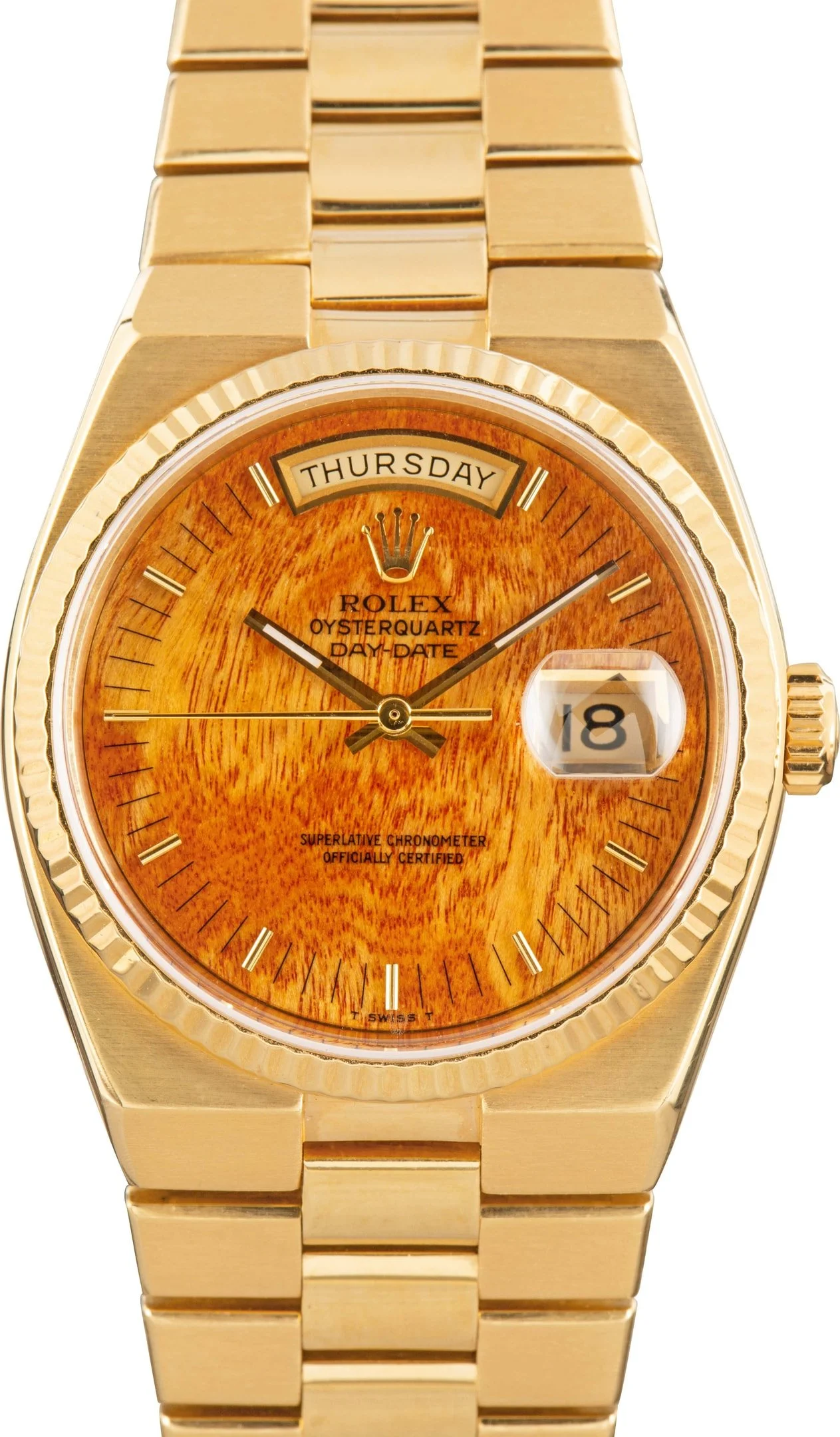 Why We Love This Watch This pre-owned Rolex OysterQuartz Day-Date ref. 19018 (1982) is a truly exceptional and collectible timepiece, featuring a 36mm 18k yellow gold case and a unique wood dial that exudes character and elegance. Powered by the precise Caliber 5035 quartz movement, it offers reliable day and date functions. Its iconic integral 18k gold bracelet completes the luxurious design, while water resistance up to 100 meters adds practical versatility. A rare combination of innovation, style, and prestige, this OysterQuartz stands out as a remarkable piece for any discerning collector. WATCH DETAILS BRAND Rolex MODEL NAME Day-Date 36 COLLECTION Day Date MODEL NUMBER 19018 YEAR 1982 ITEM NUMBER 184541 C CONDITION Vintage GENDER Mens Unisex BOX & PAPERS Box and Papers CASE MATERIAL Yellow Gold CRYSTAL Sapphire SIZE 36MM BEZEL 18k Yellow Gold Fluted CASEBACK Solid SERIAL 7145XXX DIAL Wood w/ Index hour markers, Tritium hands & Tritium lume MOVEMENT CALIBRE 5055 TYPE Quartz BEZEL Fixed COMPLICATION Date BRACELET MATERIAL Yellow Gold TYPE Integral CLASP Concealed folding Crownclasp