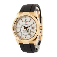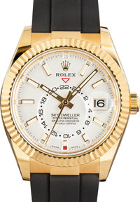 Why We Love This Watch This Rolex Sky-Dweller ref 326238 (2012–2025) showcases a bold 42mm 18k yellow gold case with a signature fluted bezel and a crisp white index dial, offering dual time zone functionality and an annual calendar. Paired with a black Oysterflex strap for a modern, comfortable fit, it’s powered by the sophisticated Caliber 9001, making this reference a standout blend of innovation, luxury, and everyday practicality. WATCH DETAILS CREDIT CARD PRICE $36,009.86 BRAND Rolex MODEL NAME Sky-Dweller MODEL NUMBER 326238 ITEM NUMBER 175169 CONDITION Excellent GENDER Mens BOX & PAPERS No Box or Papers CASE MATERIAL Yellow Gold CRYSTAL Sapphire SIZE 42MM BEZEL 18k Yellow Gold Fluted SERIAL J23P5XXX DIAL White w/ Index hour markers, Chromalight hands & Chromalight lume MOVEMENT CALIBRE 9001 TYPE Automatic BEZEL Positional COMPLICATION Date BRACELET MATERIAL Rubber TYPE Oysterflex CLASP Oysterclasp