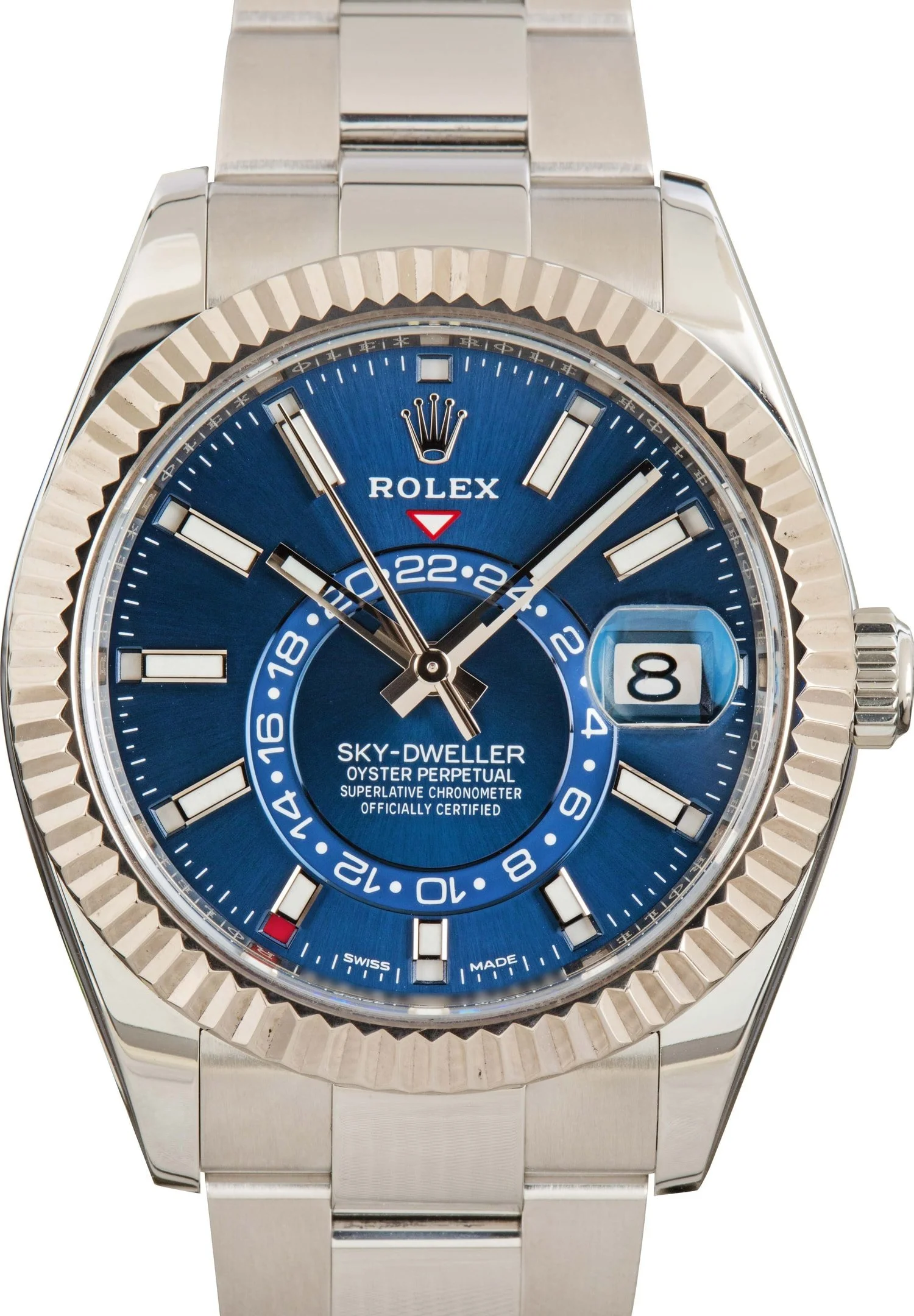 Why We Love This Watch This pre-owned Rolex Sky-Dweller ref. 326934 (2017–2023) offers the perfect blend of sophisticated style and advanced functionality. Crafted in stainless steel with an 18k white gold fluted bezel, this dual-time annual calendar is designed for frequent travelers and watch enthusiasts alike. The bold aesthetic and innovative Saros calendar system make it one of Rolex’s most impressive modern complications—a statement piece that’s as practical as it is prestigious. WATCH DETAILS CREDIT CARD PRICE $24,690.86 BRAND Rolex MODEL NAME Sky-Dweller MODEL NUMBER 326934 ITEM NUMBER 180274 CONDITION Excellent GENDER Mens BOX & PAPERS Box Only CASE MATERIAL Stainless Steel CRYSTAL Sapphire SIZE 42MM BEZEL 18k White Gold Fluted SERIAL 6J046XXX DIAL Blue w/ Index hour markers, Chromalight hands & Chromalight lume MOVEMENT CALIBRE 9001 TYPE Automatic BEZEL Positional COMPLICATION Annual Calendar BRACELET MATERIAL Stainless Steel TYPE Oyster CLASP Oysterclasp