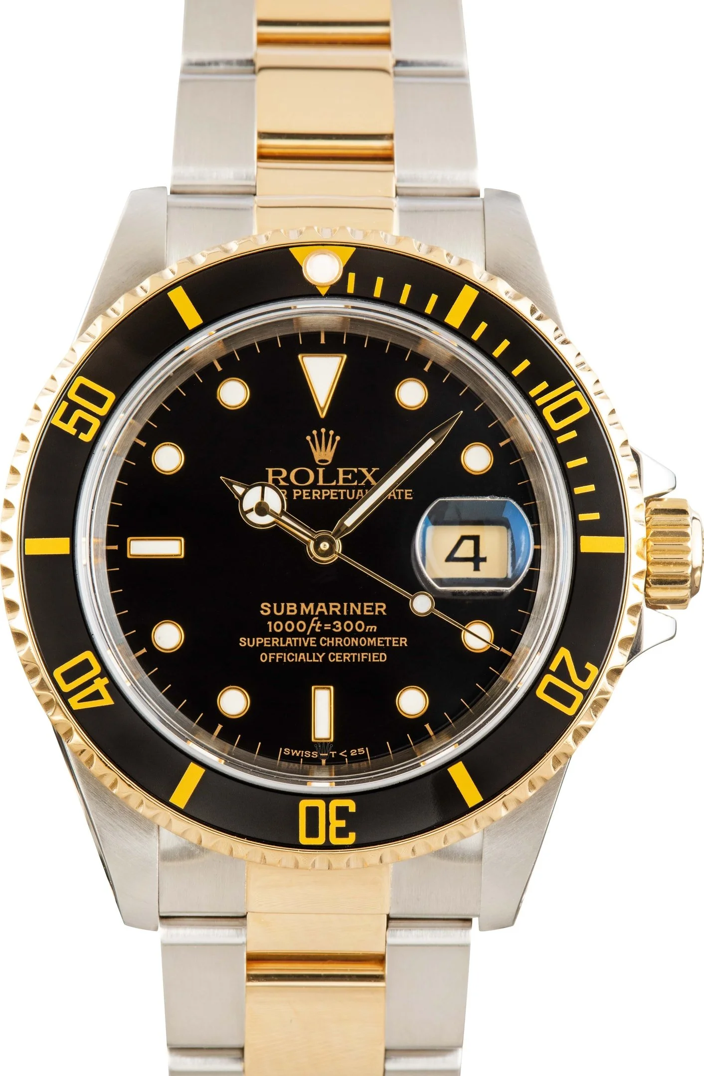 Why We Love This Watch This pre-owned Rolex Submariner ref. 16613 (1995) embodies classic Submariner style and performance. Crafted from stainless steel and 18k yellow gold, this 40mm model features a black dial paired with a matching black bezel. Powered by the Rolex Caliber 3135 automatic movement and fitted on a two-tone Oyster bracelet, this Submariner offers precision, durability, and timeless elegance—ideal for collectors and everyday wear alike. WATCH DETAILS BRAND Rolex MODEL NAME Submariner MODEL NUMBER 16613 YEAR 1995 ITEM NUMBER 181016 CONDITION Excellent GENDER Mens BOX & PAPERS No Box or Papers CASE MATERIAL Steel and Gold CRYSTAL Sapphire SIZE 40MM BEZEL Aluminum Timing CASEBACK Solid SERIAL W860XXX DIAL Black w/ Tritium hour markers, Tritium hands & Tritium lume MOVEMENT CALIBRE 3135 TYPE Automatic BEZEL Unidirectional COMPLICATION Date BRACELET MATERIAL Two-Tone TYPE Oyster CLASP Steel Through Fliplock