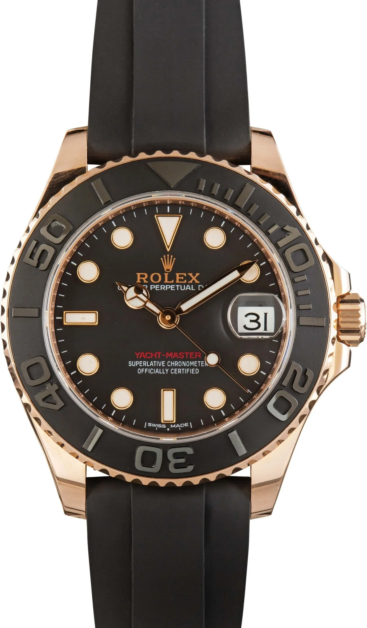 Why We Love This Watch This pre-owned Rolex Yacht-Master ref. 268655 (2015) offers a refined expression of nautical luxury, crafted in warm 18k Everose gold with a perfectly balanced 37mm case. A matte black dial is framed by a bidirectional Cerachrom bezel with raised polished numerals, creating a striking contrast that feels both sporty and elegant. Secured on an innovative Oysterflex bracelet with an Everose gold Oysterlock clasp, sized to fit a 6-inch wrist, this Yacht-Master is powered by Caliber 2236 automatic movement from Rolex, delivering dependable precision and everyday versatility that transitions seamlessly from sea to shore. WATCH DETAILS CREDIT CARD PRICE $25,514.06 BRAND Rolex MODEL NAME Yacht-Master 37 COLLECTION Yacht-Master MODEL NUMBER 268655 YEAR 2015 ITEM NUMBER 184442 C CONDITION Excellent GENDER Mens Unisex BOX & PAPERS Box and Papers/Card CASE MATERIAL Rose Gold CRYSTAL Sapphire SIZE 37MM BEZEL Ceramic Timing CASEBACK Solid SERIAL F9846XXX DIAL Black w/ Luminous hour markers, Chromalight hands & Chromalight lume MOVEMENT CALIBRE 2236 TYPE Automatic BEZEL Bidirectional COMPLICATION Date BRACELET MATERIAL Rubber TYPE Oysterflex CLASP Oysterlock