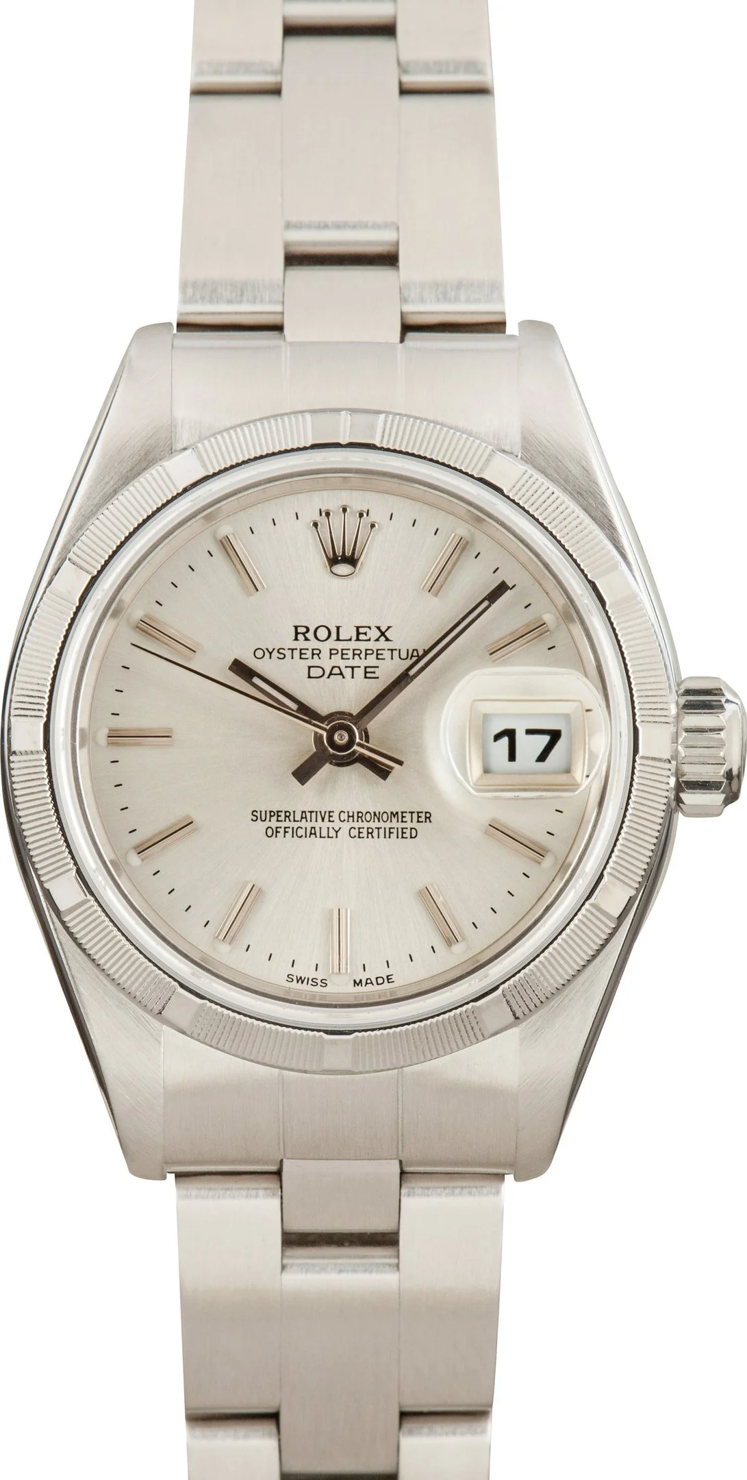 Why We Love This Watch This pre-owned Ladies Rolex Date ref. 79190 (1999) showcases a classic 26mm stainless steel case paired with a silver dial and engine-turned bezel for understated elegance. The iconic Oyster bracelet ensures both comfort and a sleek profile on the wrist. Powered by Rolex’s automatic Caliber 2235, this Date delivers reliable precision and timeless style, making it a versatile and enduring addition to any collection. WATCH DETAILS BRAND Rolex MODEL NAME Date MODEL NUMBER 79190 YEAR 1999 ITEM NUMBER 185052 CONDITION Excellent GENDER Womens BOX & PAPERS No Box or Papers CASE MATERIAL Stainless Steel CRYSTAL Sapphire SIZE 26MM BEZEL Stainless Steel Engine Turned CASEBACK Solid SERIAL A387XXX DIAL Silver w/ Index hour markers, Superluminova hands & Superluminova lume MOVEMENT CALIBRE 2135 TYPE Automatic BEZEL Fixed COMPLICATION Date BRACELET MATERIAL Stainless Steel TYPE Oyster CLASP Oysterclasp