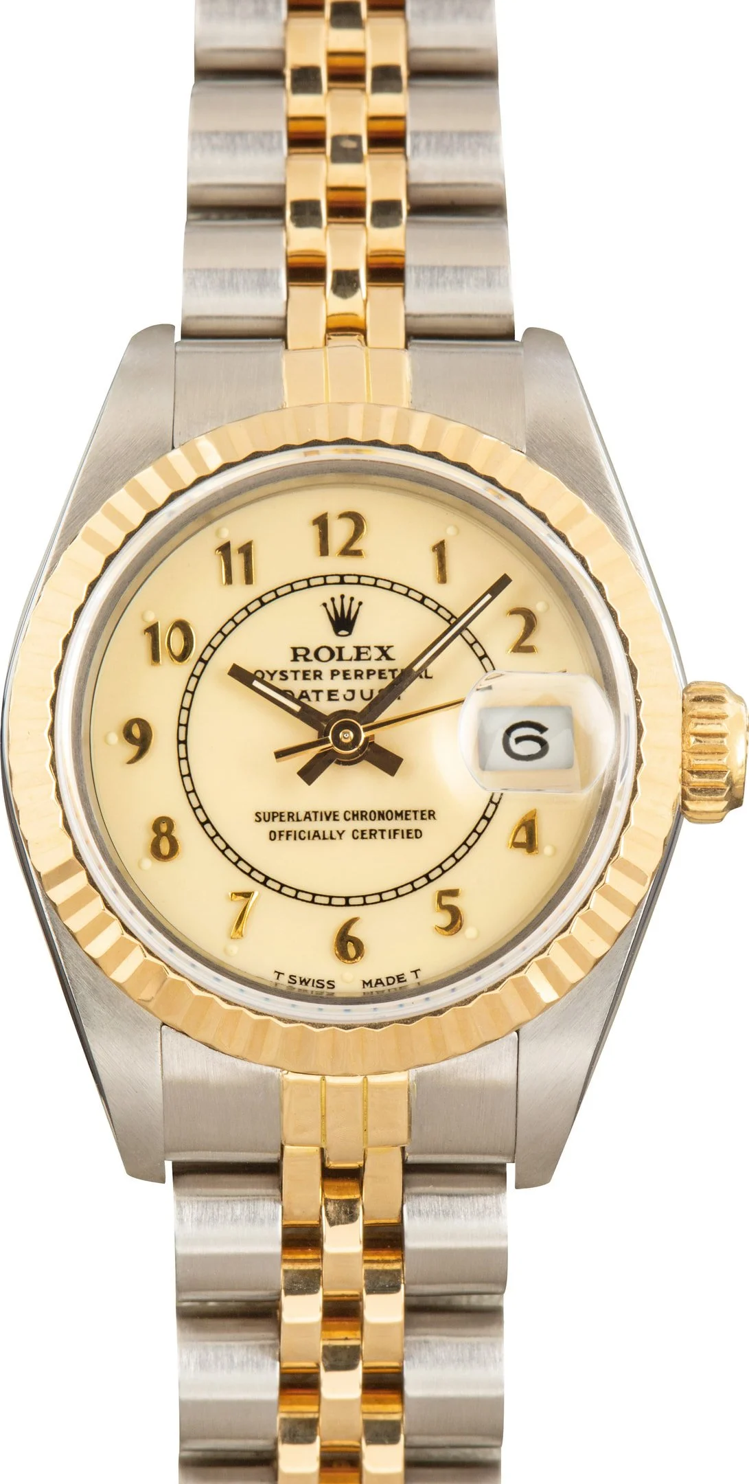 Why We Love This Watch This pre-owned Ladies Rolex Datejust ref. 69173 (1986) features a refined 26mm case with an ivory dial, Arabic numerals, and decorative detailing, all framed by a classic fluted bezel. Paired with a timeless Jubilee bracelet, this elegant watch combines Rolex’s legendary craftsmanship with enduring style, making it perfect for both everyday wear and special occasions. WATCH DETAILS CREDIT CARD PRICE $6,477.56 BRAND Rolex MODEL NAME Lady Datejust COLLECTION Datejust MODEL NUMBER 69173 YEAR 1986 ITEM NUMBER 185375 CONDITION Excellent GENDER Womens BOX & PAPERS No Box or Papers CASE MATERIAL Steel and Gold CRYSTAL Sapphire SIZE 26MM BEZEL 18k Yellow Gold Fluted CASEBACK Solid SERIAL 9074XXX DIAL Ivory w/ Arabic hour markers, Tritium hands & Tritium lume MOVEMENT CALIBRE 2135 TYPE Automatic BEZEL Fixed COMPLICATION Date BRACELET MATERIAL Two-Tone TYPE Jubilee CLASP Oysterclasp