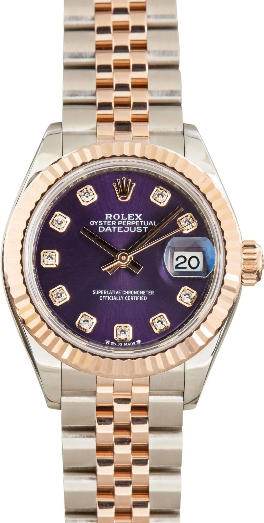Why We Love This Watch This pre-owned Rolex Datejust ref. 279171 (2022) features a 28mm stainless steel case with an 18k Everose gold fluted bezel, paired with a striking aubergine dial set with diamond hour markers. Powered by the Caliber 2236 automatic movement, it offers Chronometer-certified precision, a date function with Cyclops lens at 3 o’clock, and water resistance to 100 meters (330 feet). The watch is completed on a two-tone Jubilee bracelet, combining refined elegance with modern Lady-Datejust sophistication. WATCH DETAILS BRAND Rolex MODEL NAME Lady Datejust COLLECTION Datejust MODEL NUMBER 279171 YEAR 2022 ITEM NUMBER 185942 CONDITION Excellent GENDER Womens BOX & PAPERS Box and Papers CASE MATERIAL Steel and Rose Gold CRYSTAL Sapphire SIZE 28MM BEZEL 18k Rose Gold Fluted CASEBACK Solid SERIAL Y734HXXX DIAL Purple Diamond w/ Diamond hour markers, Nonluminous hands & Nonluminous lume MOVEMENT CALIBRE 2236 TYPE Automatic BEZEL Fixed COMPLICATION Date BRACELET MATERIAL Two-Tone TYPE Jubilee CLASP Concealed folding Crownclasp