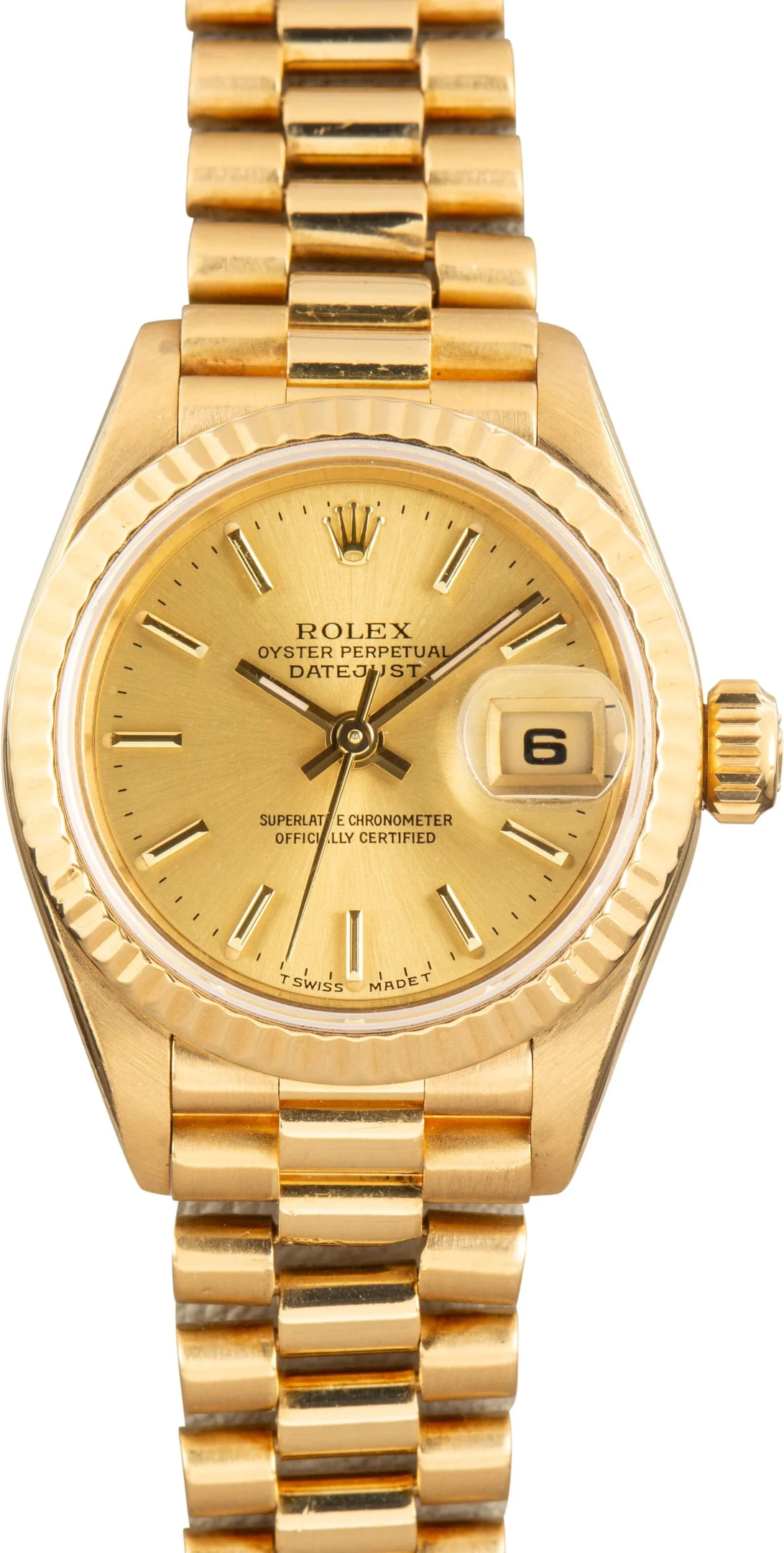 Why We Love This Watch This pre-owned Ladies Rolex Datejust ref. 69178 (1996) features a champagne dial with index hour markers, housed in a 26 mm 18k case accented by the signature fluted bezel. Fitted with the elegant President bracelet and secure folding clasp, it offers timeless comfort and sophistication on the wrist. Powered by the Perpetual, mechanical, self-winding movement, it delivers precision and reliability, while the date display with Cyclops lens ensures legibility. This Datejust exemplifies classic Rolex craftsmanship, refined style, and enduring elegance. WATCH DETAILS BRAND Rolex MODEL NAME Lady Datejust COLLECTION Datejust MODEL NUMBER 69178 YEAR 1996 ITEM NUMBER 185775 CONDITION Excellent GENDER Womens BOX & PAPERS No Box or Papers CASE MATERIAL Yellow Gold CRYSTAL Sapphire SIZE 26MM BEZEL 18k Yellow Gold Fluted CASEBACK Solid SERIAL T641XXX DIAL Champagne w/ Index hour markers, Tritium hands & Tritium lume MOVEMENT CALIBRE 2135 TYPE Automatic BEZEL Fixed COMPLICATION Date BRACELET MATERIAL Yellow Gold TYPE President CLASP Concealed folding Crownclasp