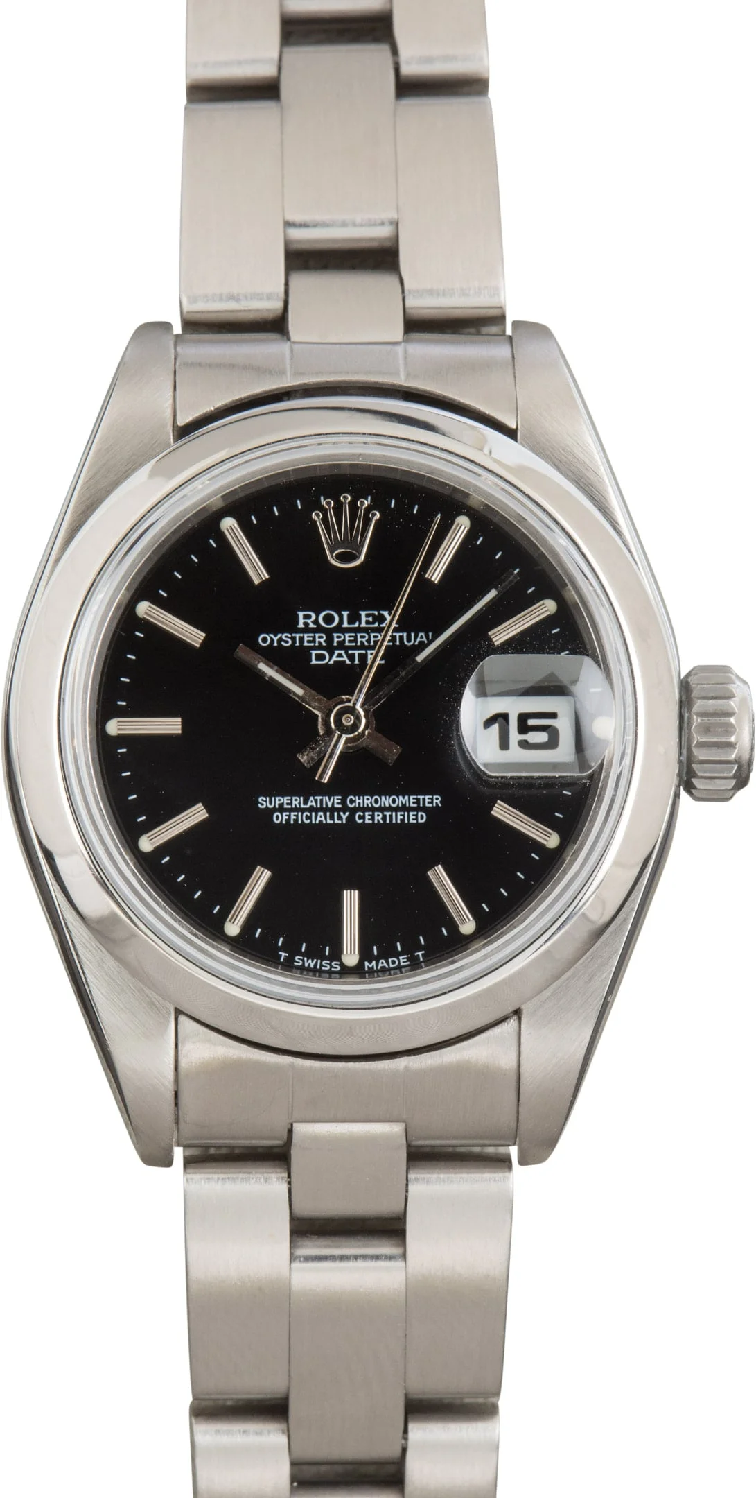 Why We Love This Watch This pre-owned Ladies Rolex Date ref. 69160 (1999) features a 26 mm stainless steel case with a smooth bezel, paired with a sleek black dial. Powered by the reliable Caliber 2135 automatic movement, it delivers precise, everyday performance. Fitted with a stainless steel Oyster bracelet with folding clasp, this Rolex Date combines classic style, comfort, and timeless craftsmanship—making it an elegant choice for daily wear or special occasions. WATCH DETAILS BRAND Rolex MODEL NAME Date MODEL NUMBER 69160 YEAR 1999 ITEM NUMBER 186207 CONDITION Excellent GENDER Womens BOX & PAPERS No Box or Papers CASE MATERIAL Stainless Steel CRYSTAL Sapphire SIZE 26MM BEZEL Stainless Steel Smooth CASEBACK Solid SERIAL A1?6XXX DIAL Black w/ Index hour markers, Tritium hands & Tritium lume MOVEMENT CALIBRE 2135 TYPE Automatic BEZEL Fixed COMPLICATION Date BRACELET MATERIAL Stainless Steel TYPE Oyster CLASP Oysterclasp