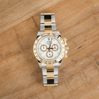 Why We Love This Watch This pre-owned Rolex Daytona ref 126503 (2023) commands attention with a 40mm stainless steel case and 18k yellow gold tachymeter bezel, blending rugged sportiness with refined luxury. The crisp white index dial delivers instant legibility, while the two-tone Oyster bracelet adds unmistakable presence. Driven by Rolex’s high-performance Caliber 4131, this chronograph fuses precision engineering with timeless, aggressive style. WATCH DETAILS CREDIT CARD PRICE $28,806.86 BRAND Rolex MODEL NAME Daytona MODEL NUMBER 126503 YEAR 2023 ITEM NUMBER 184103 CONDITION Excellent GENDER Mens BOX & PAPERS Box and Papers CASE MATERIAL Steel and Gold CRYSTAL Sapphire SIZE 40MM BEZEL 18k Yellow Gold Tachymetric CASEBACK Solid SERIAL 189AXXXX DIAL White w/ Index hour markers, Chromalight hands & Chromalight lume MOVEMENT CALIBRE 4131 TYPE Automatic BEZEL Fixed COMPLICATION Chronograph BRACELET MATERIAL Two-Tone TYPE Oyster CLASP Oysterlock