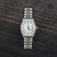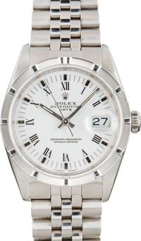 Why We Love This Watch Pre-owned Rolex Date ref. 15210 (1990) features a 34mm stainless steel case with an engine-turned bezel and a unique white dial combining both index and Roman numeral hour markers. Powered by an automatic movement and paired with a stainless steel Jubilee bracelet, this versatile timepiece blends refined styling with Rolex’s renowned precision. WATCH DETAILS BRAND Rolex MODEL NAME Date MODEL NUMBER 15210 YEAR 1990 ITEM NUMBER 180877 CONDITION Excellent GENDER Mens Womens Unisex BOX & PAPERS No Box or Papers CASE MATERIAL Stainless Steel CRYSTAL Sapphire SIZE 34MM BEZEL Stainless Steel Engine Turned CASEBACK Solid SERIAL E168XXX DIAL White w/ Roman hour markers, Tritium hands & Tritium lume MOVEMENT CALIBRE 3135 TYPE Automatic BEZEL Fixed COMPLICATION Date BRACELET MATERIAL Stainless Steel TYPE Jubilee CLASP Oysterclasp