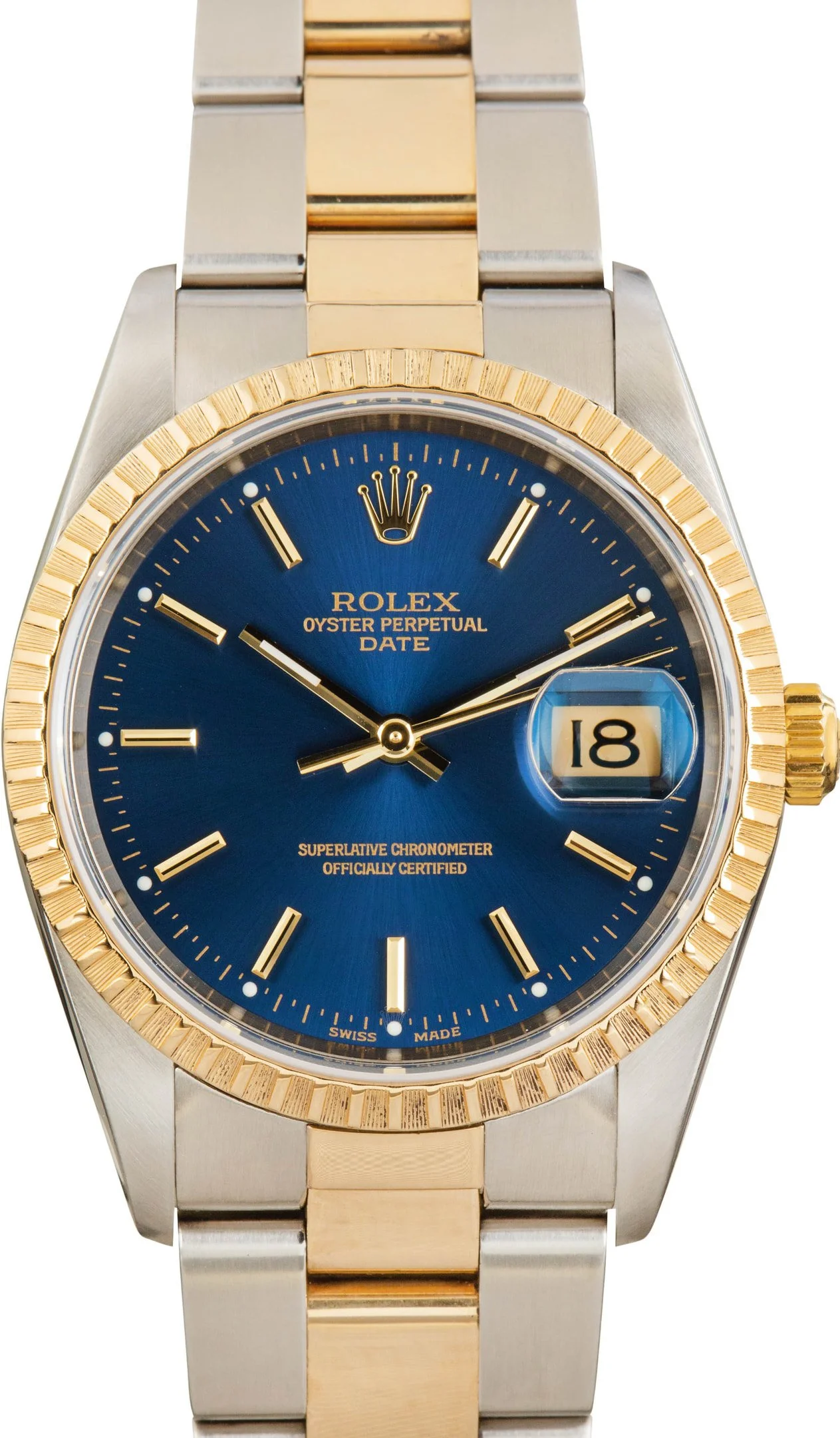 Why We Love This Watch This pre-owned Rolex Date ref 15223 (2006–2007) offers a refined blend of elegance and practicality in a 34mm design. The stainless steel case is paired with an 18k yellow gold engine-turned bezel, adding subtle texture and character. Its rich blue index dial provides striking contrast, while the two-tone Oyster bracelet lends a sportier, versatile look. Powered by the dependable Caliber 3135 automatic movement, this Rolex Date delivers precision, durability, and timeless appeal in a perfectly balanced form. WATCH DETAILS BRAND Rolex MODEL NAME Date MODEL NUMBER 15223 YEAR 2007 ITEM NUMBER 183977 CONDITION Excellent GENDER Mens Womens Unisex BOX & PAPERS No Box or Papers CASE MATERIAL Steel and Gold CRYSTAL Sapphire SIZE 34MM BEZEL 18k Yellow Gold Engine Turned CASEBACK Solid SERIAL Z341XXX DIAL Blue w/ Index hour markers, Superluminova hands & Superluminova lume MOVEMENT CALIBRE 3135 TYPE Automatic BEZEL Fixed COMPLICATION Date BRACELET MATERIAL Two-Tone TYPE Oyster CLASP Oysterclasp