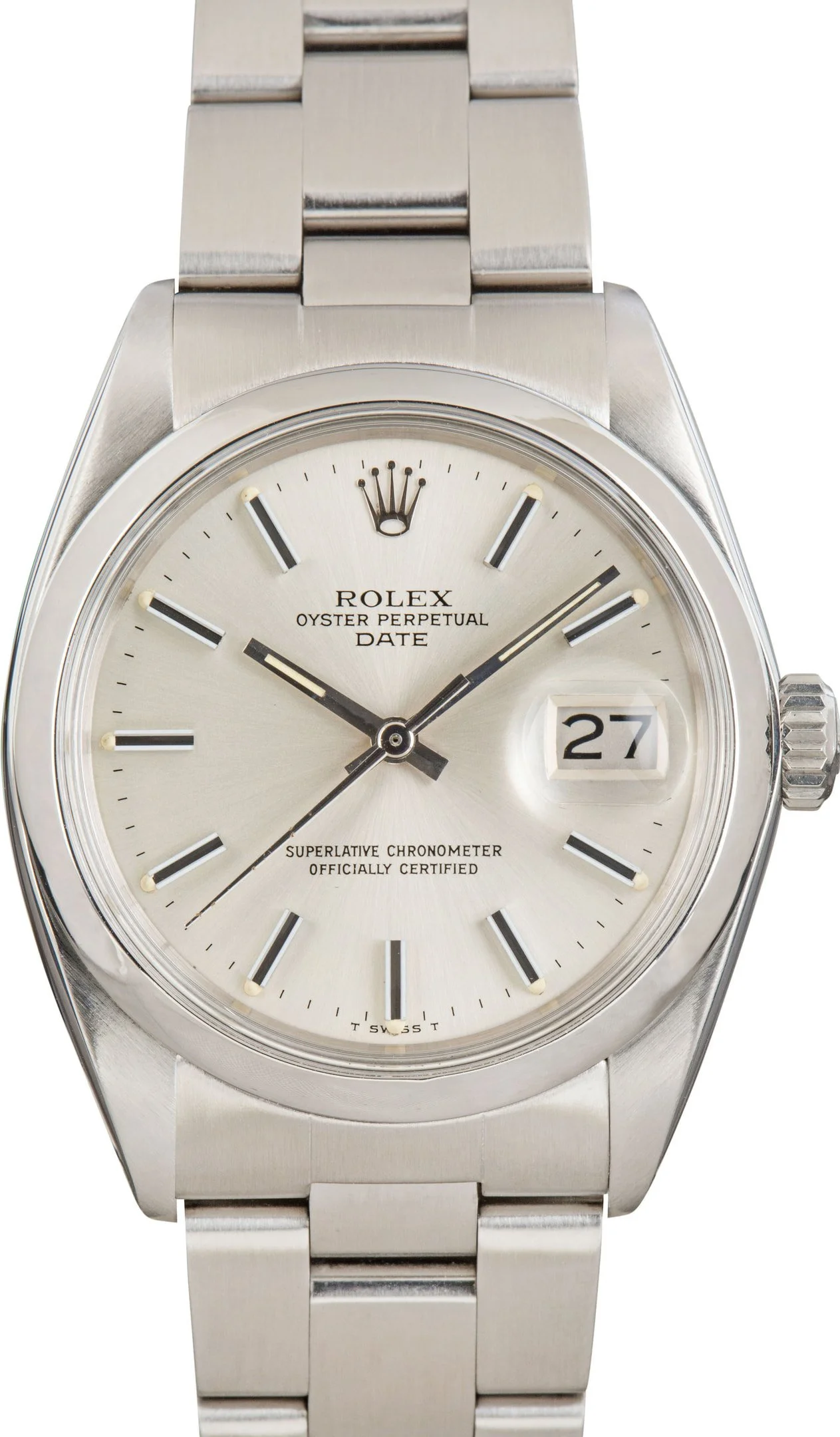Why We Love This Watch This Rolex Date ref 1500 (1963) features a 34mm stainless steel case with a smooth bezel and a silver index dial, delivering a clean, understated aesthetic. It’s fitted with an oyster bracelet with a Oysterclasp and is powered by the reliable Caliber 1570, embodying vintage Rolex simplicity and precision. WATCH DETAILS BRAND Rolex MODEL NAME Date MODEL NUMBER 1500 YEAR 1963 ITEM NUMBER 182136 CONDITION Excellent GENDER Mens Womens Unisex BOX & PAPERS No Box or Papers CASE MATERIAL Stainless Steel CRYSTAL Acrylic SIZE 34MM BEZEL Stainless Steel Smooth CASEBACK Solid SERIAL 963XXX DIAL Silver w/ Index hour markers, Tritium hands & Tritium lume MOVEMENT CALIBRE 1570 TYPE Automatic BEZEL Fixed COMPLICATION Date BRACELET MATERIAL Stainless Steel TYPE Oyster CLASP Oysterclasp