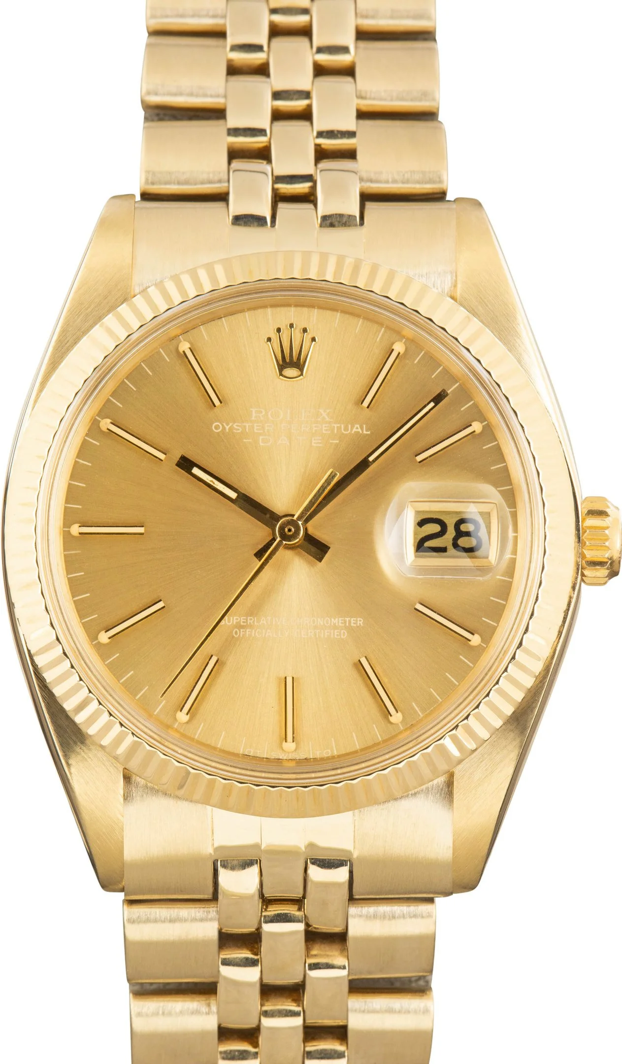 Why We Love This Watch This pre-owned Rolex Date ref. 1503 (circa 1977) features a champagne dial with date display at 3 o’clock, housed in a 34mm 14k yellow gold case with a fluted bezel. Powered by the Rolex 1570 automatic movement and paired with an American oval link Jubilee bracelet, this vintage Date delivers classic Rolex elegance, timeless style, and enduring craftsmanship. WATCH DETAILS CREDIT CARD PRICE $11,931.26 BRAND Rolex MODEL NAME Date MODEL NUMBER 1503 YEAR 1977 ITEM NUMBER 184243 CONDITION Vintage GENDER Mens Womens Unisex BOX & PAPERS No Box or Papers CASE MATERIAL Yellow Gold CRYSTAL Acrylic SIZE 34MM BEZEL 14k Yellow Gold Fluted CASEBACK Solid SERIAL 5061XXX DIAL Champagne w/ Index hour markers, Tritium hands & Tritium lume MOVEMENT CALIBRE 1570 TYPE Automatic BEZEL Fixed COMPLICATION Date BRACELET MATERIAL Yellow Gold TYPE Jubilee CLASP Oysterclasp