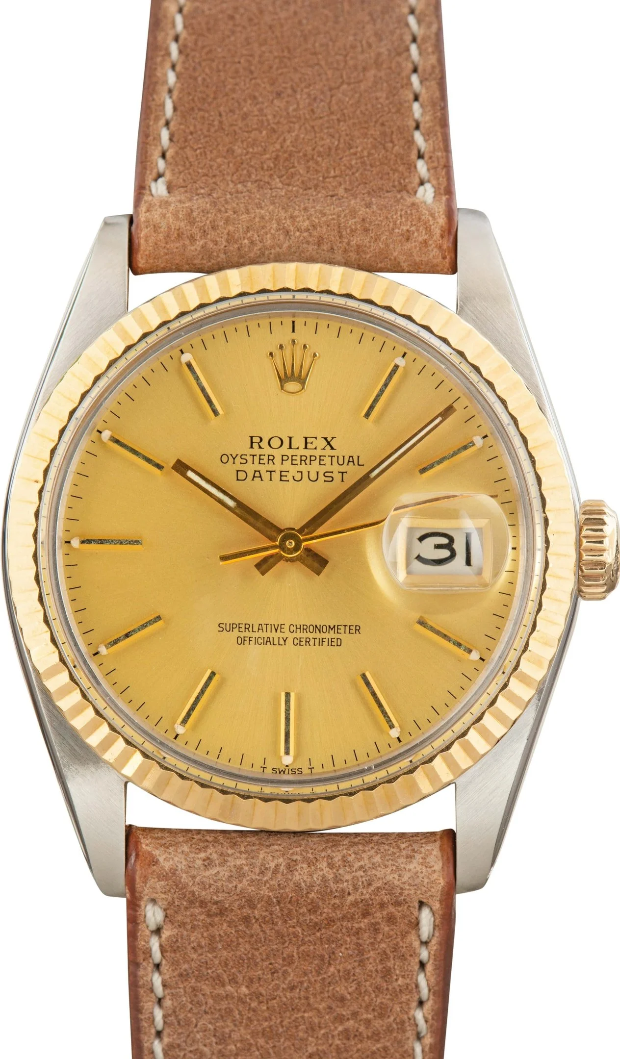 Why We Love This Watch This pre-owned Rolex Datejust 36 ref 16013 (1988) exudes classic sophistication with its 36mm stainless steel and 18k yellow gold case and fluted bezel. The champagne dial features a date window at 3 o’clock beneath a Cyclops lens, while a brown leather strap adds a refined and versatile touch. Powered by Rolex’s automatic movement, this Datejust offers reliable precision and timeless style. WATCH DETAILS CREDIT CARD PRICE $5,139.86 BRAND Rolex MODEL NAME Datejust 36 COLLECTION Datejust MODEL NUMBER 16013 YEAR 1981 ITEM NUMBER 183072 CONDITION Excellent GENDER Mens Unisex BOX & PAPERS No Box or Papers CASE MATERIAL Steel and Gold CRYSTAL Acrylic SIZE 36MM BEZEL 18k Yellow Gold Fluted CASEBACK Solid SERIAL 7032XXX DIAL Champagne w/ Index hour markers, Tritium hands & Tritium lume MOVEMENT CALIBRE 3035 TYPE Automatic BEZEL Fixed COMPLICATION Date BRACELET MATERIAL Leather TYPE Leather CLASP Tang Buckle