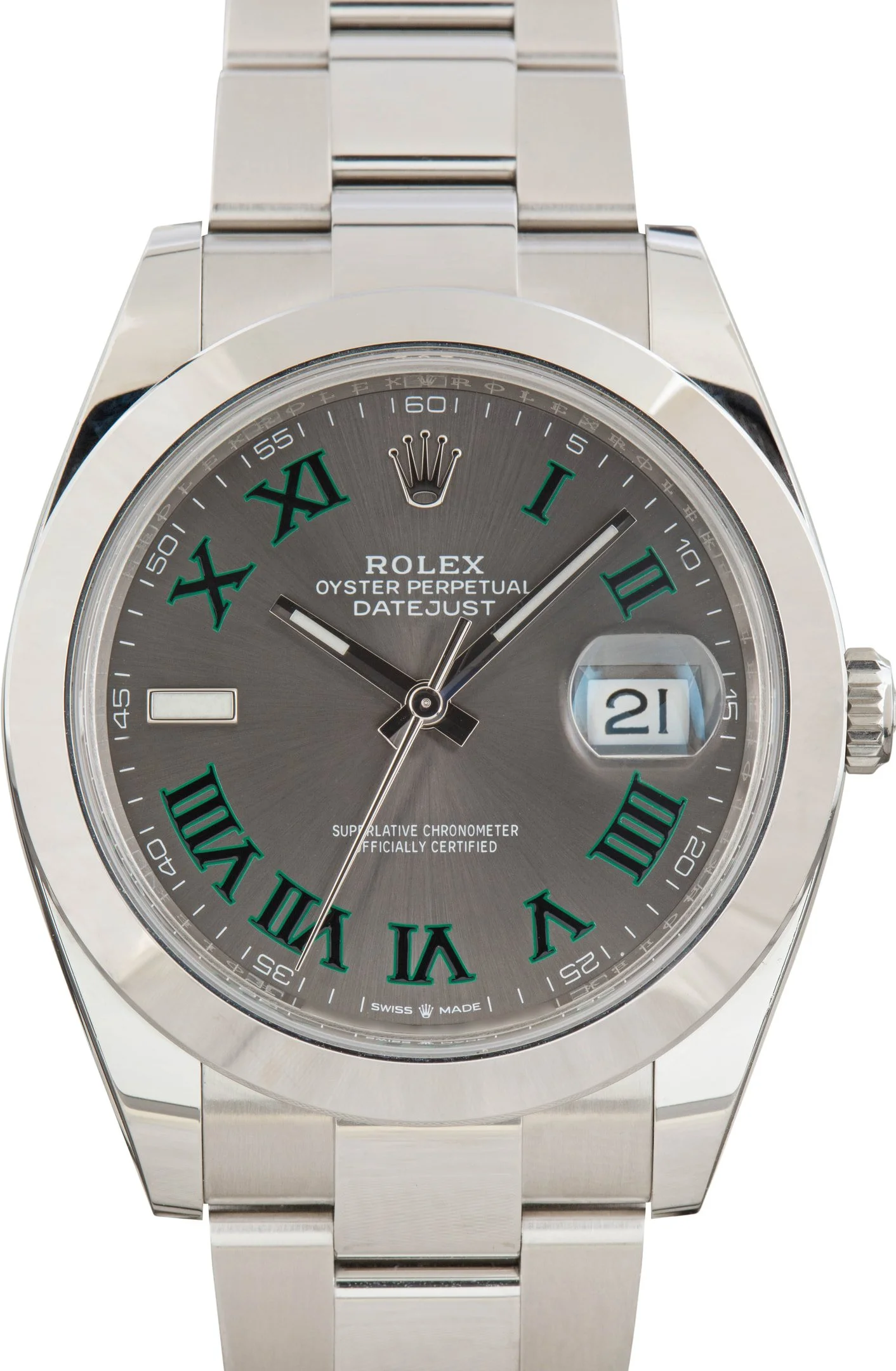 Why We Love This Watch This pre-owned Rolex Datejust 41 ref 126300 (2022) reimagines a timeless icon with a contemporary touch. The 41mm stainless steel case features a smooth bezel and is paired with a robust Oyster bracelet for a modern, versatile look. Its signature Wimbledon dial, with green Roman numerals set against a slate gray background, adds a distinctive and elegant flair. Powered by the Rolex Caliber 3235 automatic movement, it offers exceptional precision, a 70-hour power reserve, and lasting durability. A perfect balance of sophistication and sportiness, this Datejust 41 stands out with effortless style. WATCH DETAILS BRAND Rolex MODEL NAME Datejust 41 MODEL NUMBER 126300 YEAR 2022 ITEM NUMBER 184598 CONDITION Excellent GENDER Mens BOX & PAPERS Box and Papers CASE MATERIAL Stainless Steel CRYSTAL Sapphire SIZE 41MM BEZEL Stainless Steel Smooth CASEBACK Solid SERIAL 07R31XXX DIAL Slate Wimbledon w/ Roman hour markers, Chromalight hands & Chromalight lume MOVEMENT CALIBRE 3235 TYPE Automatic BEZEL Fixed COMPLICATION Date BRACELET MATERIAL Stainless Steel TYPE Oyster CLASP Oysterclasp