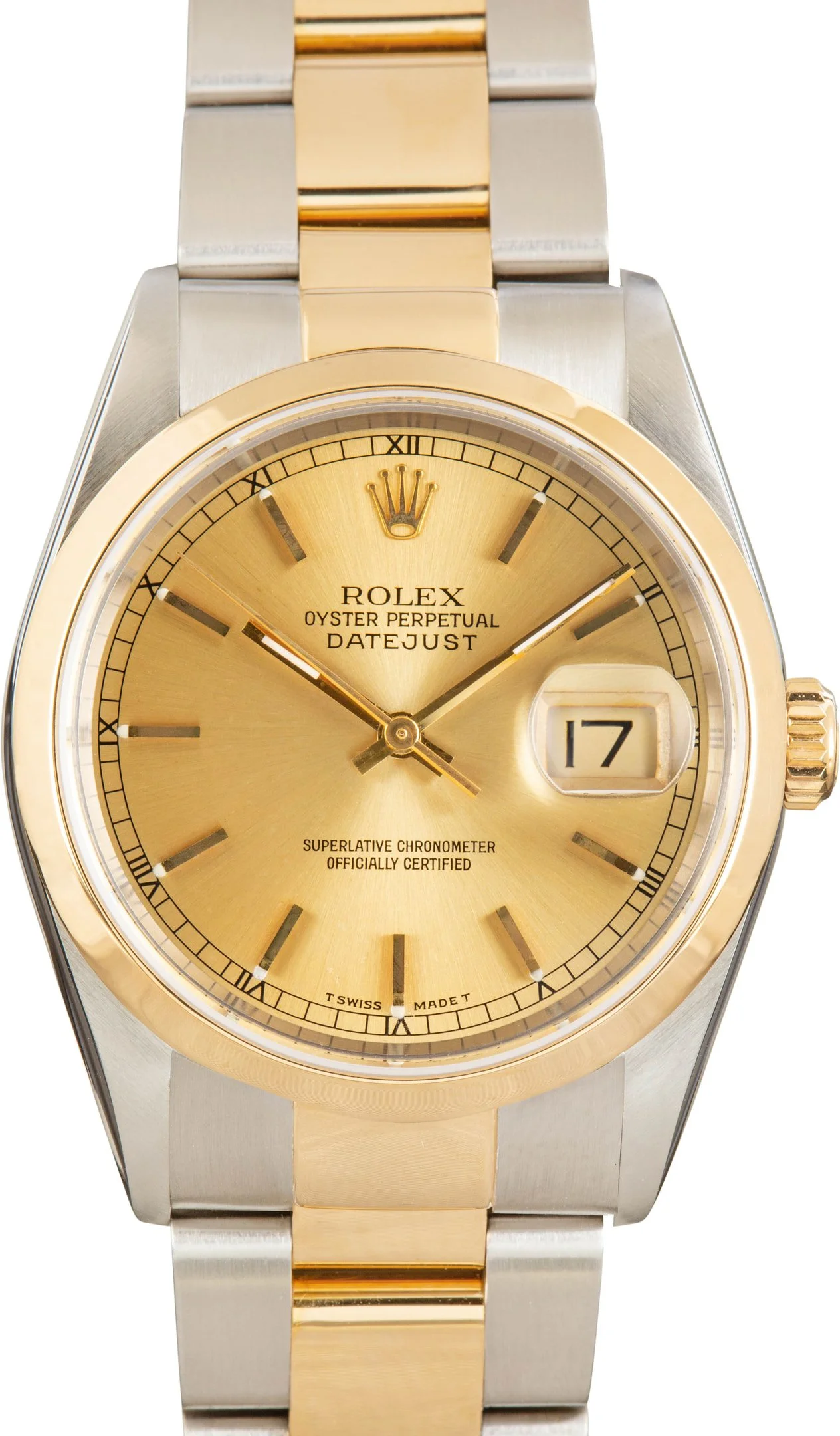 Why We Love This Watch This pre-owned Rolex Datejust 36 ref 16203 (1995) blends classic design with timeless versatility. Featuring a radiant champagne dial, smooth bezel, and signature Oyster bracelet, this two-tone model showcases the refined balance of stainless steel and 18k yellow gold. At its core beats the trusted Caliber 3135 automatic movement, known for its precision and durability. A sophisticated take on a Rolex icon, this Datejust 36 is perfect for those who appreciate understated elegance with enduring performance. WATCH DETAILS CREDIT CARD PRICE $8,226.86 BRAND Rolex MODEL NAME Datejust 36 COLLECTION Datejust MODEL NUMBER 16203 YEAR 1995 ITEM NUMBER 183860 CONDITION Excellent GENDER Mens Unisex BOX & PAPERS Box and Papers CASE MATERIAL Steel and Gold CRYSTAL Sapphire SIZE 36MM BEZEL 18k Yellow Gold Smooth CASEBACK Solid SERIAL W650XXX DIAL Champagne w/ Index hour markers, Tritium hands & Tritium lume MOVEMENT CALIBRE 3135 TYPE Automatic BEZEL Fixed COMPLICATION Date BRACELET MATERIAL Two-Tone TYPE Oyster CLASP Oysterclasp