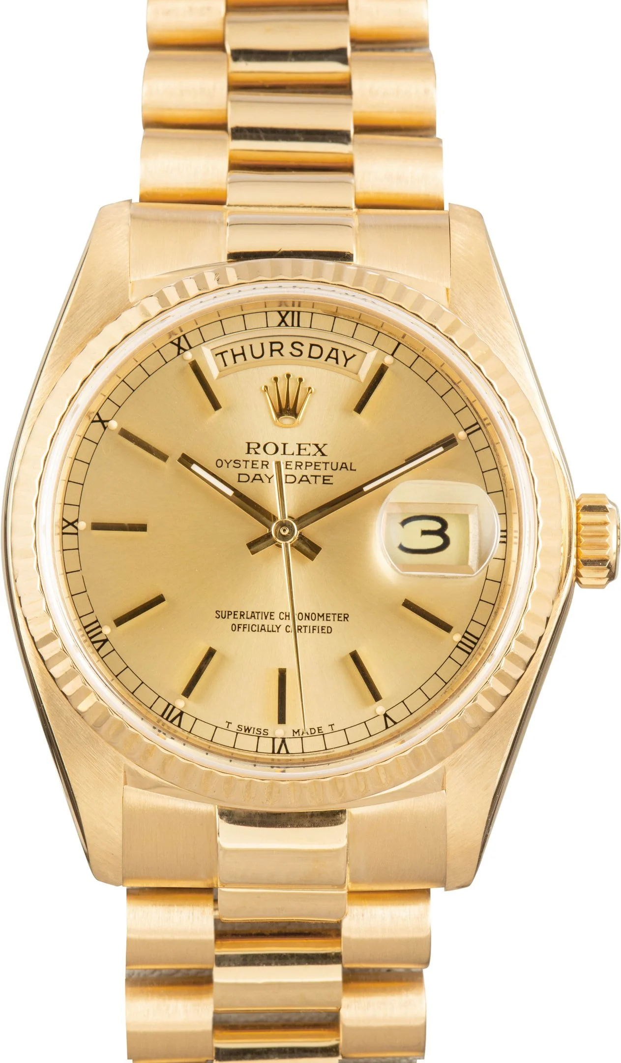 Why We Love This Watch This pre-owned Rolex Day-Date 36 ref. 18038 (1979) is a quintessential expression of classic Rolex prestige. Crafted in 18k yellow gold, this iconic model features a rich champagne dial that perfectly complements its timeless design. Known as the “President,” the Day-Date earned its legendary status through its association with world leaders and influential figures, as well as its exclusive use of precious metals. The band shows some dings consistent with age, reflecting its history as a cherished vintage timepiece. A true statement piece, this Day-Date 36 embodies enduring elegance, heritage, and unmistakable Rolex craftsmanship. WATCH DETAILS BRAND Rolex MODEL NAME Day-Date 36 COLLECTION Day Date MODEL NUMBER 18038 YEAR 1979 ITEM NUMBER 184444 CONDITION Vintage GENDER Mens Unisex BOX & PAPERS No Box or Papers CASE MATERIAL Yellow Gold CRYSTAL Sapphire SIZE 36MM BEZEL 18k Yellow Gold Fluted CASEBACK Solid SERIAL 6116XXX DIAL Champagne w/ Index hour markers, Tritium hands & Tritium lume MOVEMENT CALIBRE 3055 TYPE Automatic BEZEL Fixed COMPLICATION Date BRACELET MATERIAL Yellow Gold TYPE President CLASP Concealed folding Crownclasp