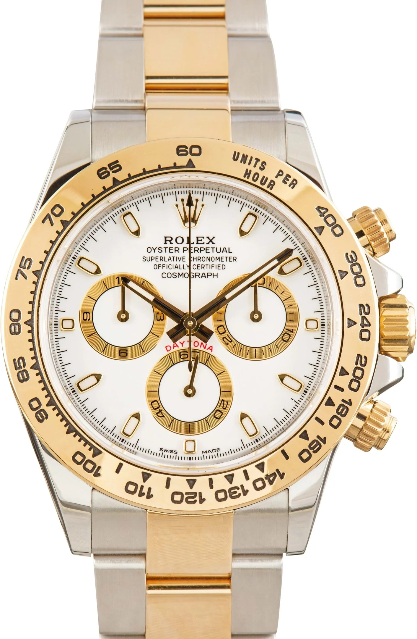 Why We Love This Watch Pre-owned Rolex Daytona ref. 116503 (2011–2021) is a striking two-tone chronograph featuring a white dial with gold sub-dials and Indexhour markers. Crafted from stainless steel and 18k yellow gold, the 40mm case pairs perfectly with the classic Oyster bracelet. Powered by Rolex’s Caliber 4130, it offers precision, a 72-hour power reserve, and legendary Daytona performance—an ideal choice for collectors and enthusiasts seeking luxury and sport in one timeless package. WATCH DETAILS BRAND Rolex MODEL NAME Daytona MODEL NUMBER 116503 YEAR 2021 ITEM NUMBER 183974 CONDITION Excellent GENDER Mens BOX & PAPERS Box and Papers CASE MATERIAL Steel and Gold CRYSTAL Sapphire SIZE 40MM BEZEL 18k Yellow Gold Tachymetric CASEBACK Solid SERIAL E7737XXX DIAL White w/ Index hour markers, Chromalight hands & Chromalight lume MOVEMENT CALIBRE 4130 TYPE Automatic BEZEL Fixed COMPLICATION Chronograph BRACELET MATERIAL Two-Tone TYPE Oyster CLASP Oysterlock