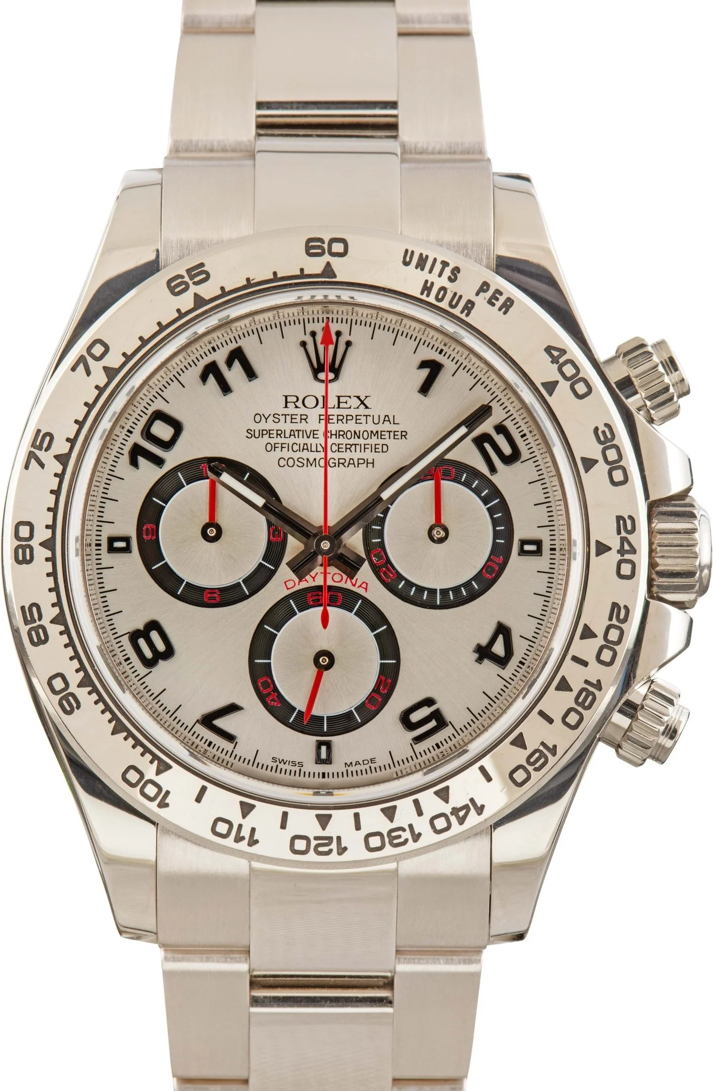 Why We Love This Watch This 40mm Daytona blends luxury and performance in 18k white gold, featuring a silver dial with Arabic numerals and Superluminova hands for exceptional legibility. Its fixed white gold tachymeter bezel enables precise timing, while the Oyster bracelet with Oysterlock clasp ensures comfort and security. Powered by Rolex’s Caliber 4130 automatic movement, this Daytona delivers legendary chronograph precision and smooth, reliable performance. WATCH DETAILS BRAND Rolex MODEL NAME Daytona MODEL NUMBER 116509 YEAR 2007 ITEM NUMBER 182328 PL CONDITION Excellent GENDER Mens BOX & PAPERS Papers Only CASE MATERIAL White Gold CRYSTAL Sapphire SIZE 40MM BEZEL 18k White Gold Tachymetric CASEBACK Solid SERIAL Z076XXX DIAL Silver w/ Arabic hour markers, Superluminova hands & Chromalight lume MOVEMENT CALIBRE 4130 TYPE Automatic BEZEL Fixed COMPLICATION Chronograph BRACELET MATERIAL White Gold TYPE Oyster CLASP Oysterlock