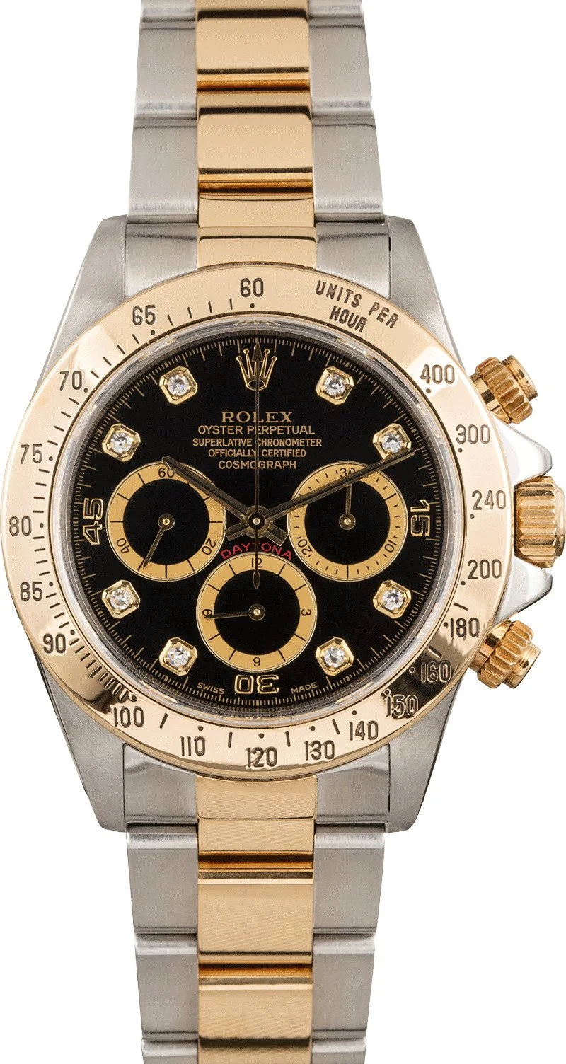 Why We Love This Watch This pre-owned Rolex Daytona ref 16523 (1999) combines sport and luxury in a striking two-tone design. It features a 40mm stainless steel case with an 18k yellow gold tachymeter bezel and a black dial set with diamond hour markers. Powered by the Rolex Caliber 4030, based on the Zenith El Primero movement, it delivers exceptional chronograph precision and reliability. Completed with a two-tone Oyster bracelet, this Daytona stands as an enduring icon of performance and prestige. WATCH DETAILS BRAND Rolex MODEL NAME Daytona MODEL NUMBER 16523 YEAR 1999 ITEM NUMBER 184041 CONDITION Excellent GENDER Mens BOX & PAPERS No Box or Papers CASE MATERIAL Steel and Gold CRYSTAL Sapphire SIZE 40MM BEZEL 18k Yellow Gold Tachymetric CASEBACK Solid SERIAL A689XXX DIAL Black Diamond w/ Arabic hour markers, Superluminova hands & Superluminova lume MOVEMENT CALIBRE 4030 TYPE Automatic BEZEL Fixed COMPLICATION Chronograph BRACELET MATERIAL Two-Tone TYPE Oyster CLASP Fliplock