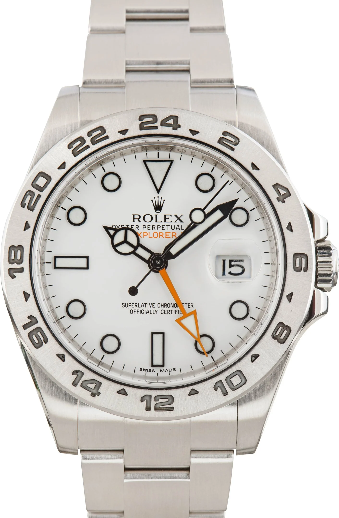 Why We Love This Watch This pre-owned Rolex Explorer II ref. 216570 (2012) features a 42mm Oystersteel case with the iconic “Polar” white dial, bold black hour markers, and an orange 24-hour hand. The fixed 24-hour bezel allows dual time-zone tracking, while the Caliber 3187 automatic movement provides a 48-hour power reserve and reliable precision. Fitted to a solid Oystersteel bracelet with Oysterlock clasp, this Explorer II combines rugged functionality with timeless Rolex design. WATCH DETAILS CREDIT CARD PRICE $11,313.86 BRAND Rolex MODEL NAME Explorer II MODEL NUMBER 216570 NICKNAME Polar YEAR 2012 ITEM NUMBER 185811 CONDITION Excellent GENDER Mens BOX & PAPERS Box and Papers CASE MATERIAL Stainless Steel CRYSTAL Sapphire SIZE 42MM BEZEL Stainless Steel 24-hour CASEBACK Solid SERIAL ZV892XXX DIAL White Polar w/ Luminous hour markers, Chromalight hands & Chromalight lume MOVEMENT CALIBRE 3187 TYPE Automatic BEZEL Fixed COMPLICATION Date BRACELET MATERIAL Stainless Steel TYPE Oyster CLASP Oysterlock