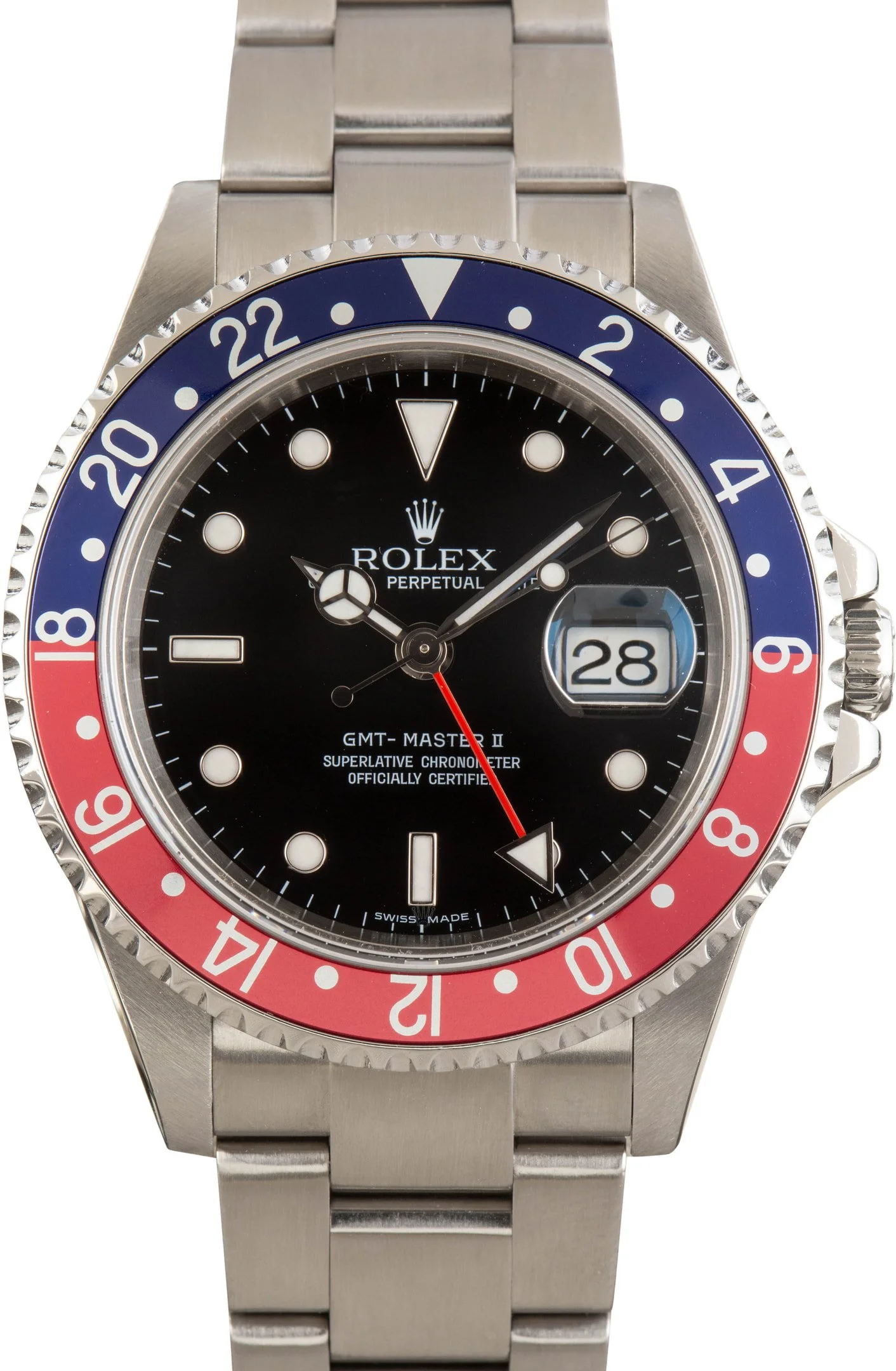 Why We Love This Watch This used Rolex GMT-Master II ref. 16710 (2006 - 2007) embodies the classic GMT design with a 40mm stainless steel case and the iconic blue-and-red "Pepsi" aluminum bezel. Its black Super-Luminova dial ensures excellent legibility, while the robust Oyster bracelet provides durability and comfort. Powered by the Caliber 3185 movement, it delivers precise timekeeping along with dual time zone functionality, making it a quintessential choice for collectors and globetrotters alike. WATCH DETAILS CREDIT CARD PRICE $16,767.56 BRAND Rolex MODEL NAME GMT-Master II COLLECTION GMT-Master MODEL NUMBER 16710 NICKNAME Pepsi YEAR 2007 ITEM NUMBER 180855 CONDITION Excellent GENDER Mens BOX & PAPERS Box Only CASE MATERIAL Stainless Steel CRYSTAL Sapphire SIZE 40MM BEZEL Aluminum 24-hour CASEBACK Solid SERIAL Z164XXX DIAL Black w/ Luminous hour markers, Superluminova hands & Superluminova lume MOVEMENT CALIBRE 3185 TYPE Automatic BEZEL Bidirectional COMPLICATION Date BRACELET MATERIAL Stainless Steel TYPE Oyster CLASP Fliplock
