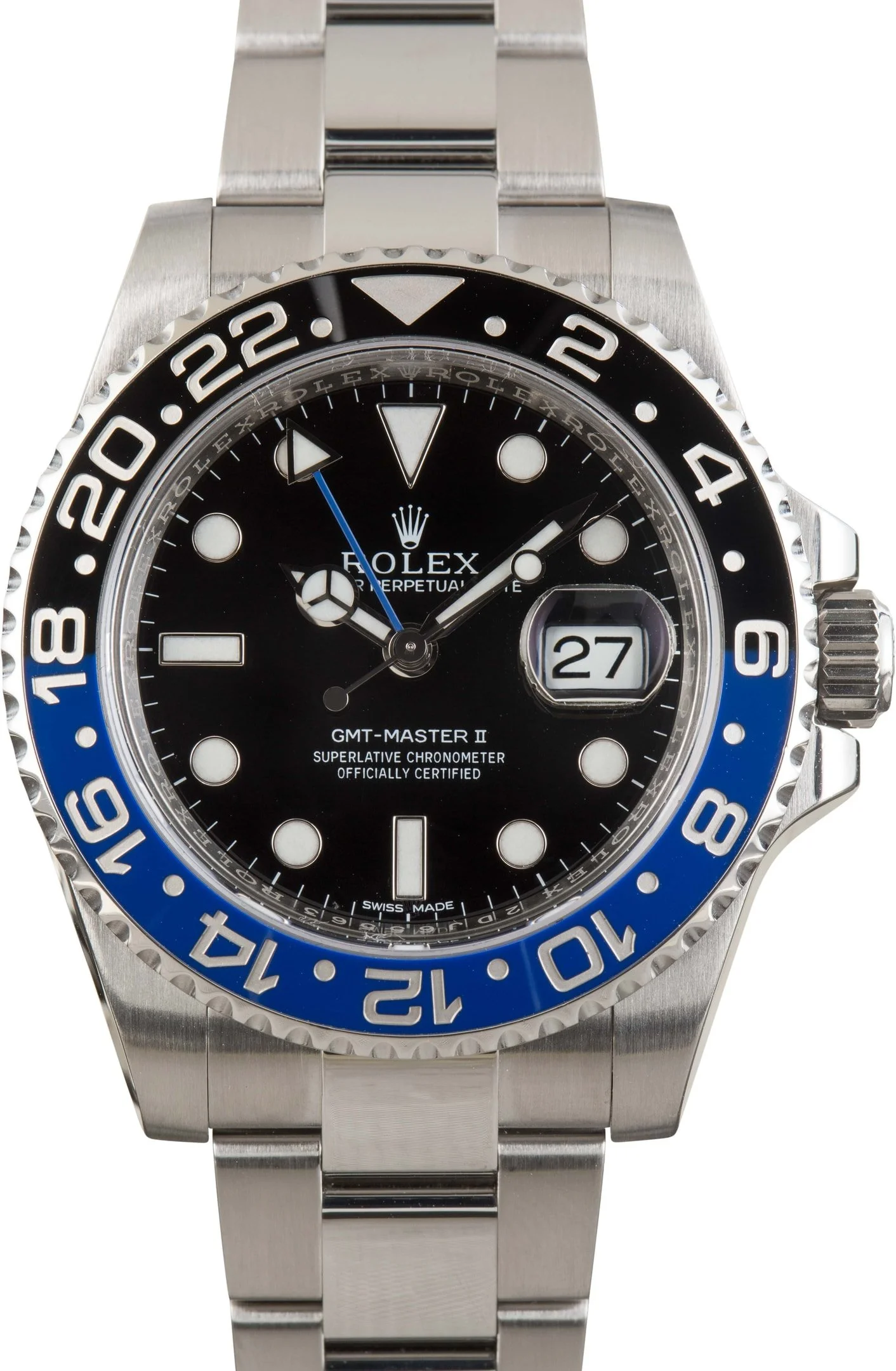 Why We Love This Watch This pre-owned Rolex GMT-Master II ref. 116710BLNR (2013), known as the “Batman,” showcases a 40mm stainless steel case paired with the distinctive black-and-blue Cerachrom bezel designed for dual time zone tracking. The black dial features luminous hands and hour markers for excellent visibility, protected by a scratch-resistant sapphire crystal. Fitted with a durable Oyster bracelet, this model combines strength and comfort for daily wear. Powered by the Rolex Caliber 3186 automatic movement, it delivers precise timekeeping and dependable performance. Water-resistant to 100 meters, this GMT-Master II embodies the perfect balance of iconic design, versatility, and reliability. WATCH DETAILS BRAND Rolex MODEL NAME GMT-Master II COLLECTION GMT-Master MODEL NUMBER 116710 NICKNAME Batman YEAR 2013 ITEM NUMBER 184182 CONDITION Excellent GENDER Mens BOX & PAPERS Box and Papers CASE MATERIAL Stainless Steel CRYSTAL Sapphire SIZE 40MM BEZEL Ceramic 24-hour CASEBACK Solid SERIAL 2DJ65XXX DIAL Black w/ Luminous hour markers, Chromalight hands & Chromalight lume MOVEMENT CALIBRE 3186 TYPE Automatic BEZEL Bidirectional COMPLICATION Date BRACELET MATERIAL Stainless Steel TYPE Oyster CLASP Oysterlock