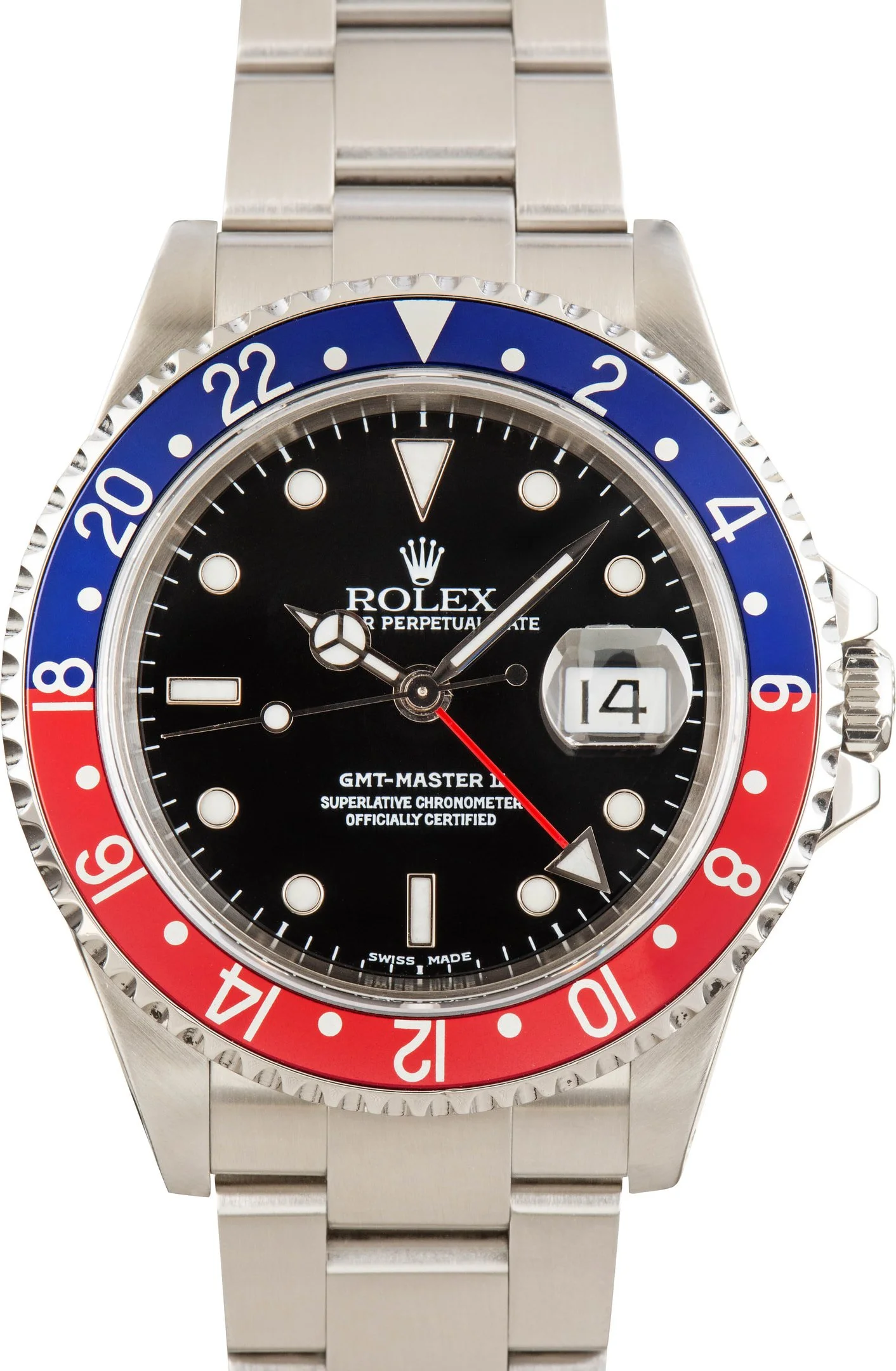 Why We Love This Watch This pre-owned Rolex GMT-Master II ref. 16710 (2000) embodies the timeless appeal of Rolex’s iconic travel watch. It features a 40mm stainless steel case paired with the signature blue-and-red “Pepsi” aluminum bezel, offering a bold and instantly recognizable aesthetic. The black Super-LumiNova dial ensures exceptional legibility in any light, while the Jubilee bracelet provides a refined and comfortable fit. Powered by the Rolex Caliber 3185 automatic movement, this GMT-Master II delivers precise timekeeping and dual time-zone functionality—an enduring favorite among collectors and world travelers. WATCH DETAILS CREDIT CARD PRICE $15,738.56 BRAND Rolex MODEL NAME GMT-Master II COLLECTION GMT-Master MODEL NUMBER 16710 NICKNAME Pepsi YEAR 2000 ITEM NUMBER 184960 CONDITION Excellent GENDER Mens BOX & PAPERS Box Only CASE MATERIAL Stainless Steel CRYSTAL Sapphire SIZE 40MM BEZEL Aluminum 24-hour CASEBACK Solid SERIAL P147XXX DIAL Black w/ Luminous hour markers, Superluminova hands & Superluminova lume MOVEMENT CALIBRE 3185 TYPE Automatic BEZEL Bidirectional COMPLICATION Date BRACELET MATERIAL Stainless Steel TYPE Oyster CLASP Fliplock