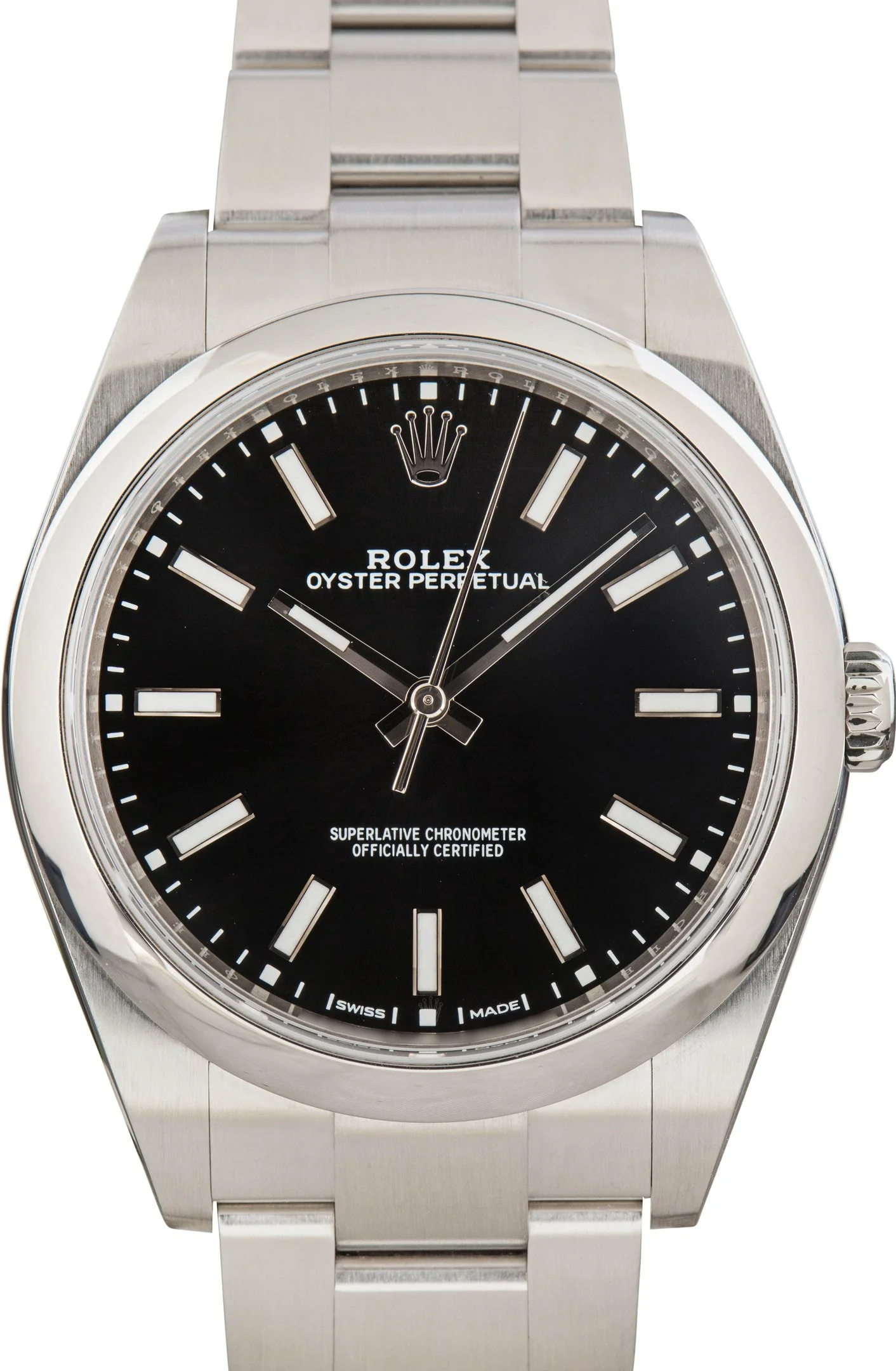 Why We Love This Watch This Rolex Oyster Perpetual ref 114300 (2015 - 2020) exemplifies the brand’s hallmark blend of elegance and performance. The 39mm stainless steel case with a smooth bezel frames a bold black dial with luminous indexes, ensuring effortless readability. Secured by the iconic Oyster bracelet, it offers both comfort and durability, while the Rolex Caliber 3132 guarantees precision and reliability. A quintessential Rolex, this Oyster Perpetual pairs timeless design with modern versatility. WATCH DETAILS CREDIT CARD PRICE $8,226.86 BRAND Rolex MODEL NAME Oyster Perpetual 39 COLLECTION Oyster Perpetual MODEL NUMBER 114300 ITEM NUMBER 183304 CONDITION Excellent GENDER Mens BOX & PAPERS No Box or Papers CASE MATERIAL Stainless Steel CRYSTAL Sapphire SIZE 39MM BEZEL Stainless Steel Smooth CASEBACK Solid SERIAL 1L3K4XXX DIAL Black w/ Index hour markers, Superluminova hands & Superluminova lume MOVEMENT CALIBRE 3132 TYPE Automatic BEZEL Fixed COMPLICATION No Date BRACELET MATERIAL Stainless Steel TYPE Oyster CLASP Oysterclasp