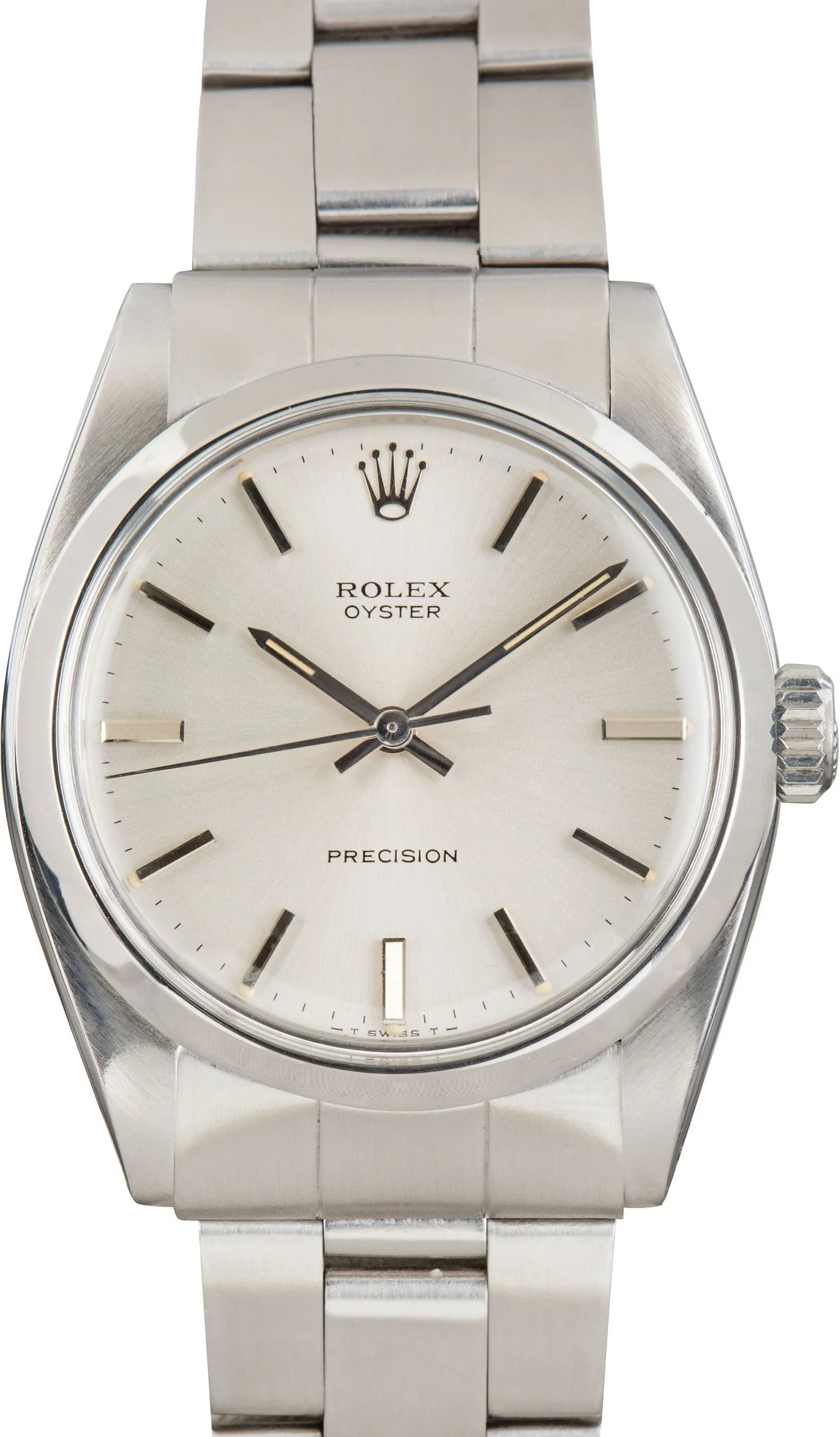 Why We Love This Watch This pre-owned Rolex Oyster Precision, reference 6426 (1975), is a vintage timepiece that combines classic design with Rolex's renowned craftsmanship. The 34mm stainless steel case is complemented by a smooth stainless steel bezel and an acrylic crystal. The silver dial features index hour markers, Tritium hands, and Tritium lume, offering a timeless aesthetic. Powered by the manual-winding Rolex Calibre 1225 movement, this model is a simple, elegant piece with no date complication. The watch comes with a stainless steel Oyster bracelet and is secured with an Oysterclasp. WATCH DETAILS BRAND Rolex MODEL NAME Oyster Precision MODEL NUMBER 6426 YEAR 1975 ITEM NUMBER 182527 CONDITION Vintage GENDER Mens Womens Unisex BOX & PAPERS No Box or Papers CASE MATERIAL Stainless Steel CRYSTAL Acrylic SIZE 34MM BEZEL Stainless Steel Smooth CASEBACK Solid SERIAL 4087XXX DIAL Silver w/ Index hour markers, Tritium hands & Tritium lume MOVEMENT CALIBRE 1225 TYPE Manual BEZEL Fixed COMPLICATION No Date BRACELET MATERIAL Stainless Steel TYPE Oyster CLASP Oysterclasp