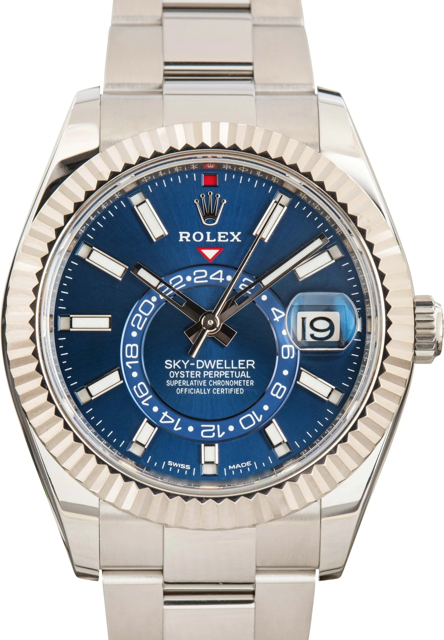 Why We Love This Watch This pre-owned Rolex Sky-Dweller ref 326934 (2022) is a masterpiece of functionality and style. Featuring a 42mm stainless steel case with a striking blue dial, it’s designed to be both sophisticated and highly functional. The watch showcases a fluted bezel, symbolizing Rolex’s iconic elegance, while the Oyster bracelet ensures a secure and comfortable fit. Powered by the Rolex Caliber 9001 movement, it features a dual time zone display and an annual calendar, making it ideal for the seasoned traveler. Combining innovative design with Rolex’s renowned precision, this Sky-Dweller is a perfect blend of form and function for any occasion. WATCH DETAILS CREDIT CARD PRICE $25,719.86 BRAND Rolex MODEL NAME Sky-Dweller MODEL NUMBER 326934 YEAR 2022 ITEM NUMBER 183838 CONDITION Excellent GENDER Mens BOX & PAPERS Box and Papers CASE MATERIAL Stainless Steel CRYSTAL Sapphire SIZE 42MM BEZEL 18k White Gold Fluted CASEBACK Solid SERIAL 84S12XXX DIAL Blue w/ Index hour markers, Chromalight hands & Chromalight lume MOVEMENT CALIBRE 9001 TYPE Automatic BEZEL Positional COMPLICATION Date BRACELET MATERIAL Stainless Steel TYPE Oyster CLASP Oysterclasp