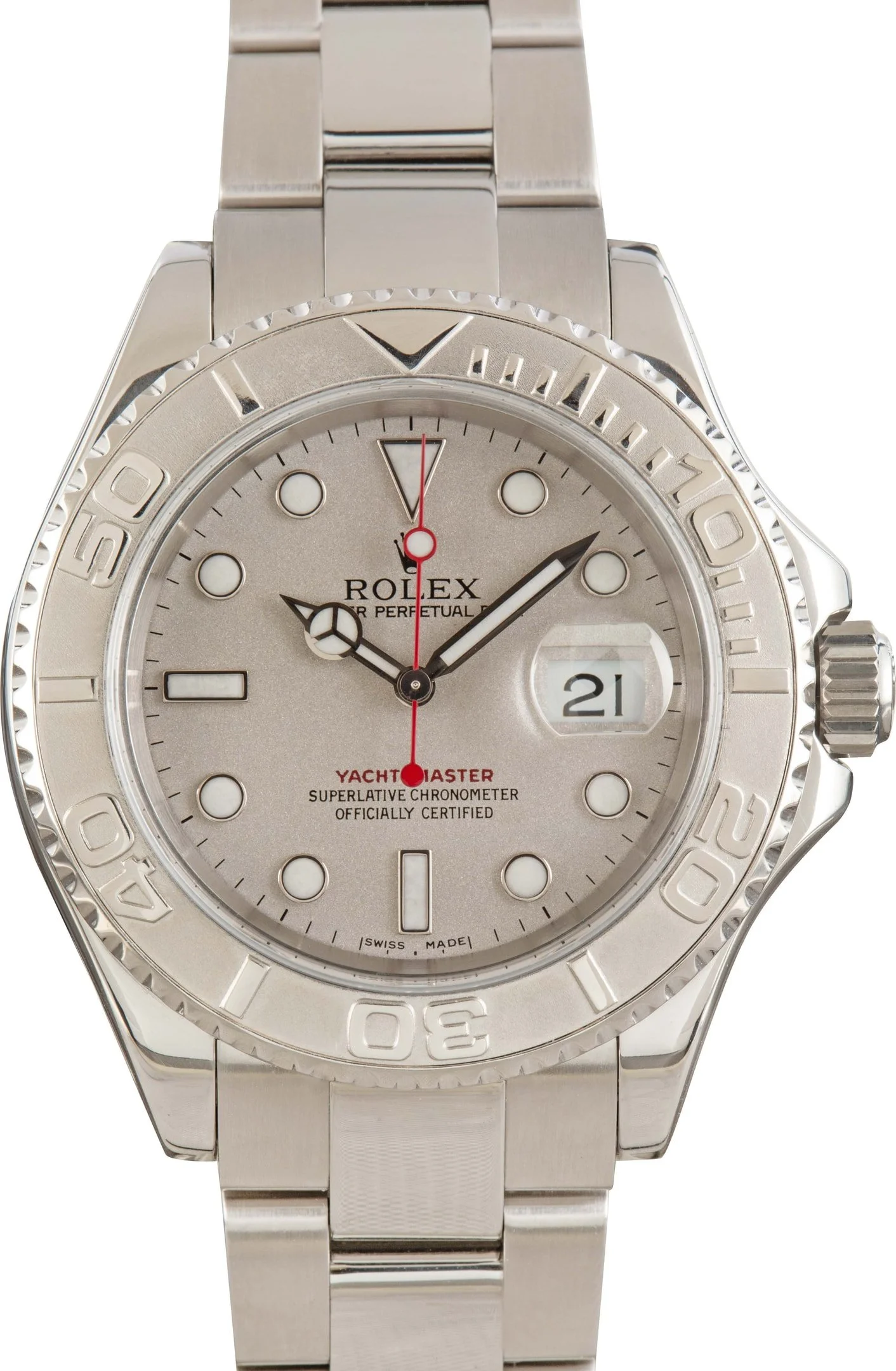 Why We Love This Watch This used Rolex Yacht-Master ref. 16622 (2001 - 2002) is crafted with a 40mm stainless steel case topped by a platinum timing bezel. Its platinum dial with Superluminova accents ensures excellent legibility, while the Oyster bracelet provides a classic fit. Inside, the reliable Caliber 3135 powers this versatile luxury sports watch. WATCH DETAILS BRAND Rolex MODEL NAME Yacht-Master 40 COLLECTION Yacht-Master MODEL NUMBER 16622 YEAR 2002 ITEM NUMBER 183386 CONDITION Excellent GENDER Mens BOX & PAPERS Rolex Service Card Only CASE MATERIAL Stainless Steel CRYSTAL Sapphire SIZE 40MM BEZEL Platinum Timing CASEBACK Solid SERIAL Y479XXX DIAL Platinum w/ Luminous hour markers, Superluminova hands & Superluminova lume MOVEMENT CALIBRE 3135 TYPE Automatic BEZEL Bidirectional COMPLICATION Date BRACELET MATERIAL Stainless Steel TYPE Oyster CLASP Fliplock