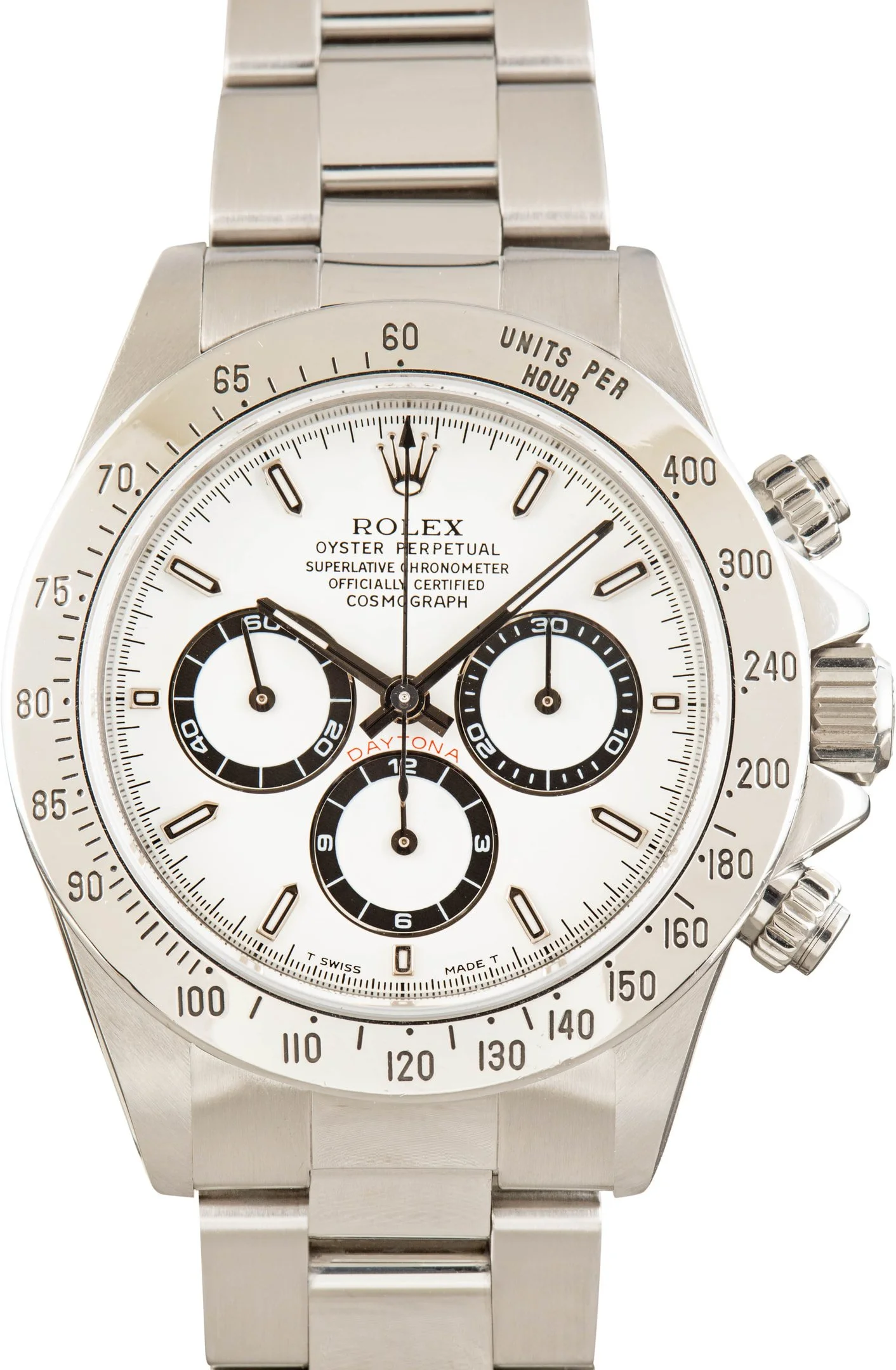 Why We Love This Watch This pre-owned Rolex Daytona ref. 16520 (circa 1996) features a white dial with chronograph subdials, housed in a 40mm stainless steel case and powered by the Zenith El Primero-based Rolex 4030 automatic movement. Fitted with a stainless steel Oyster bracelet, this Daytona combines professional racing functionality, classic chronograph styling, and the enduring precision and craftsmanship Rolex is known for. WATCH DETAILS CREDIT CARD PRICE $29,835.86 BRAND Rolex MODEL NAME Daytona MODEL NUMBER 16520 YEAR 1996 ITEM NUMBER 185498 CONDITION Excellent GENDER Mens BOX & PAPERS No Box or Papers CASE MATERIAL Stainless Steel CRYSTAL Sapphire SIZE 40MM BEZEL Stainless Steel Tachymetric CASEBACK Solid SERIAL T940XXX DIAL White w/ Index hour markers, Tritium hands & Tritium lume MOVEMENT CALIBRE 4030 TYPE Automatic BEZEL Fixed COMPLICATION Chronograph BRACELET MATERIAL Stainless Steel TYPE Oyster CLASP Fliplock