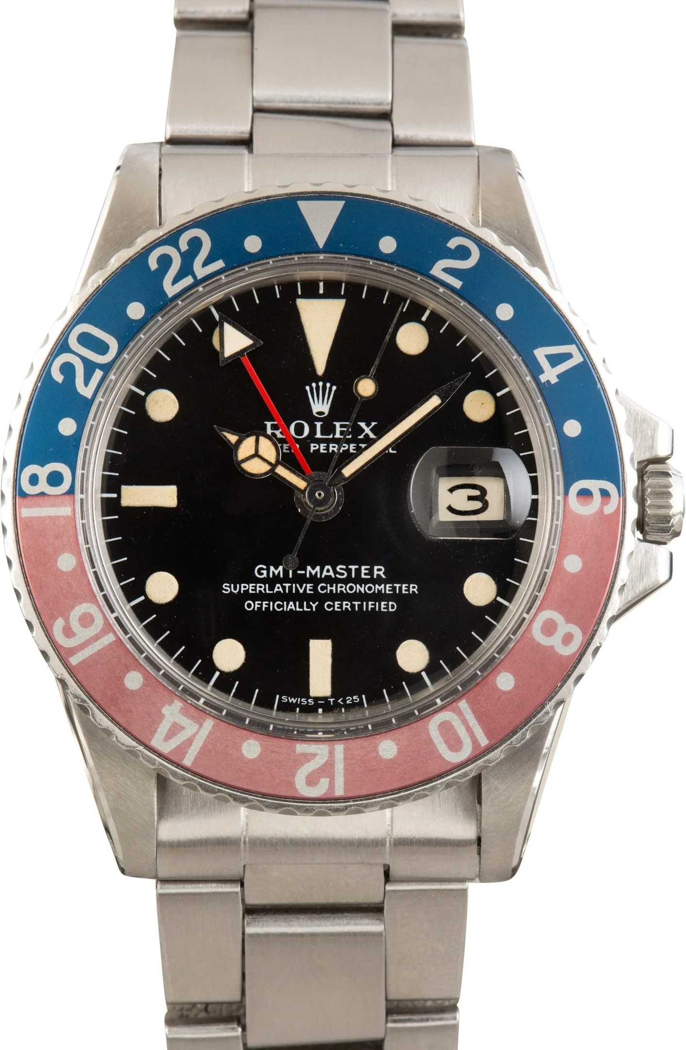 Why We Love This Watch This vintage GMT-Master retains strong period-correct integrity throughout. The bezel insert has aged to an attractive, even fade consistent with long-term natural wear, and the dial exhibits honest patina with well-preserved printing and luminous material. Housed on a folded Oyster bracelet which is seldomly seen in this condition. A compelling example for the collector seeking originality, character, and completeness in a classic GMT-Master. WATCH DETAILS CREDIT CARD PRICE $18,002.36 BRAND Rolex MODEL NAME GMT-Master MODEL NUMBER 1675 NICKNAME Pepsi YEAR Circa 1969 ITEM NUMBER 184579 CONDITION Vintage GENDER Mens BOX & PAPERS Bob's Presentation Box CASE MATERIAL Stainless Steel CRYSTAL Acrylic SIZE 40MM BEZEL Aluminum 24-hour CASEBACK Solid SERIAL 1918XXX MOVEMENT CALIBRE 1570 TYPE Automatic BEZEL Bidirectional COMPLICATION Date BRACELET MATERIAL Stainless Steel TYPE Oyster Fold-Over CLASP Oysterclasp