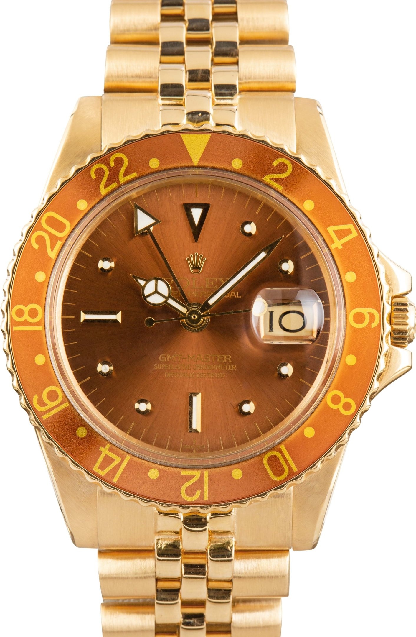 Why We Love This Watch This vintage Rolex GMT-Master ref. 1675 is a standout icon, known as the “Root Beer” for its rich brown dial and matching 24-hour bezel. Crafted in 18k yellow gold and fitted with a classic 40mm case and Jubilee bracelet, it blends bold design with vintage charm. The acrylic crystal adds a nostalgic touch, making this a must-have for collectors who appreciate Rolex history with serious style. WATCH DETAILS CREDIT CARD PRICE $25,719.86 BRAND Rolex MODEL NAME GMT-Master MODEL NUMBER 1675 YEAR Circa 1967 ITEM NUMBER 175554 CONDITION Vintage GENDER Mens BOX & PAPERS No Box or Papers CASE MATERIAL Yellow Gold CRYSTAL Acrylic SIZE 40MM BEZEL Aluminum GMT SERIAL 1741XXX MOVEMENT CALIBRE 1570 TYPE Automatic BEZEL Bidirectional COMPLICATION Date BRACELET MATERIAL Yellow Gold TYPE Jubilee CLASP Oysterclasp