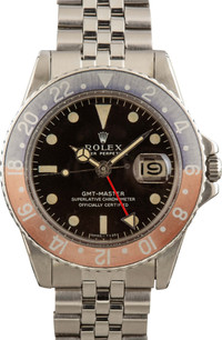 Why We Love This Watch This Rolex GMT Master 1675 is a true classic with its iconic Pepsi bezel. Known for its durability and bold design, it's a standout piece that combines style, function, and timeless appeal. WATCH DETAILS CREDIT CARD PRICE $18,002.36 BRAND Rolex MODEL NAME GMT-Master MODEL NUMBER 1675 NICKNAME Pepsi YEAR Circa 1969 ITEM NUMBER 152515 CONDITION Vintage GENDER Mens BOX & PAPERS No Box or Papers CASE MATERIAL Stainless Steel CRYSTAL Acrylic SIZE 40mm BEZEL Aluminum GMT SERIAL 2110XXX DIAL Black w/ Tritium hour markers, Tritium hands & Tritium lume MOVEMENT CALIBRE 1575 TYPE Automatic BEZEL Bidirectional COMPLICATION Date BRACELET MATERIAL Stainless Steel TYPE Jubilee CLASP Oysterclasp