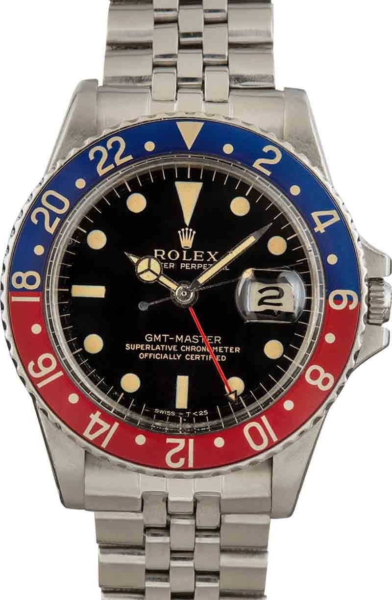 Why We Love This Watch With its roots in the adventurous era of the 1960s, this Rolex GMT-Master 40MM from 1966 captivates us with its striking black dial and vibrant Pepsi bezel. The stainless steel Jubilee bracelet adds to its timeless appeal, making it a cherished piece for collectors who appreciate its rich history and enduring craftsmanship. WATCH DETAILS CREDIT CARD PRICE $21,089.36 BRAND Rolex MODEL NAME GMT-Master MODEL NUMBER 1675 NICKNAME Pepsi YEAR Circa 1966 ITEM NUMBER 131979 CONDITION Vintage GENDER Mens BOX & PAPERS No Box or Papers CASE MATERIAL Stainless Steel CRYSTAL Acrylic SIZE 40mm BEZEL Aluminum GMT SERIAL 1334XXX MOVEMENT CALIBRE 1575 TYPE Automatic BEZEL Bidirectional COMPLICATION Date BRACELET MATERIAL Stainless Steel TYPE Jubilee CLASP Oysterclasp