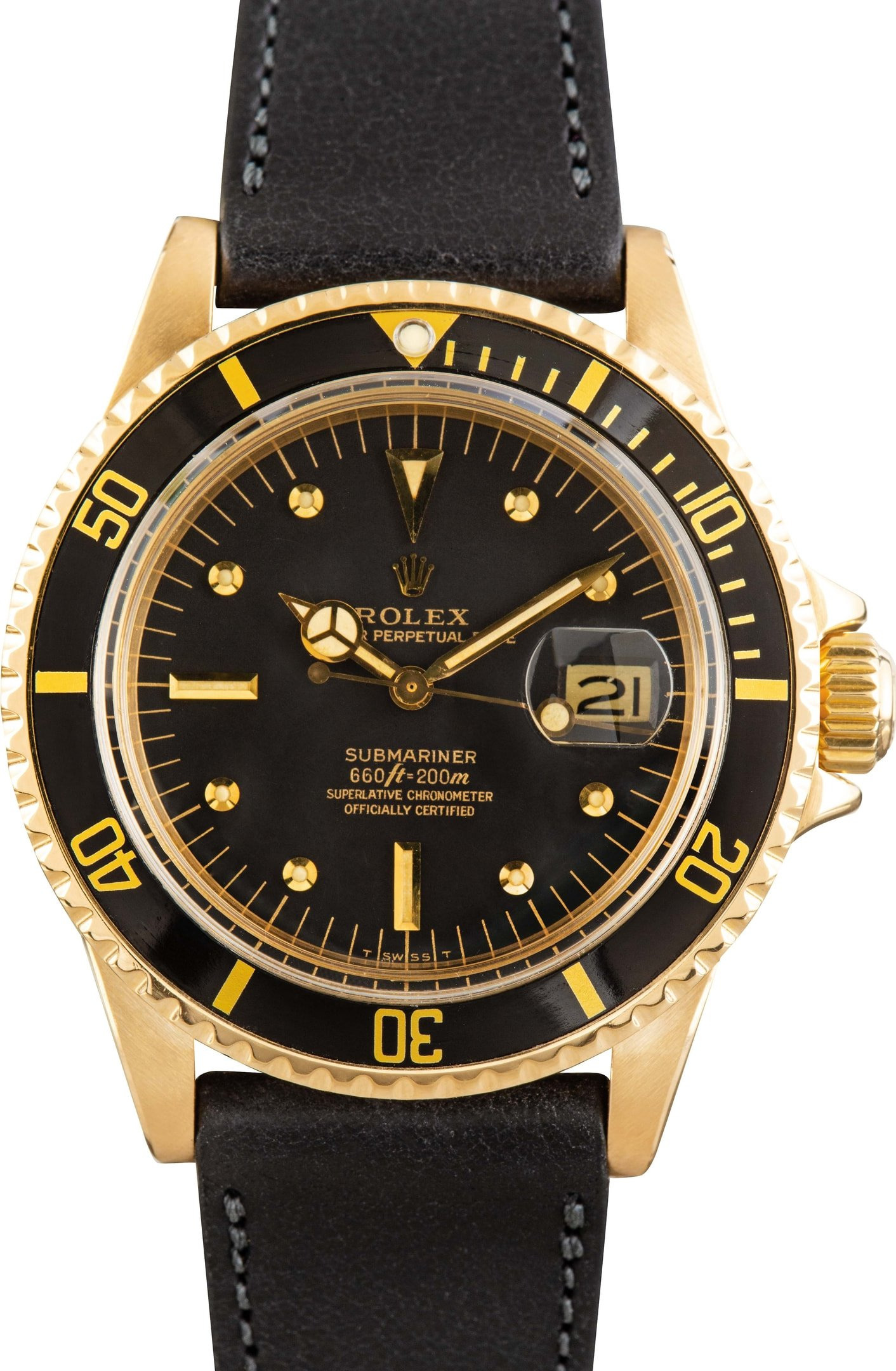 Why We Love This Watch A rare and highly sought-after example, this 40mm Submariner ref 1680 is crafted from 18k yellow gold and features the distinctive black "nipple" dial—an iconic trait of vintage gold Subs from the era. The bold contrast of gold markers against the deep black dial evokes classic 1970s style, while the watch’s character is elevated further with a Bob’s Watches leather strap for a refined, vintage-casual look. A standout piece for collectors drawn to early solid gold Submariners with unmistakable vintage charm. WATCH DETAILS CREDIT CARD PRICE $27,777.86 BRAND Rolex MODEL NAME Submariner MODEL NUMBER 1680 YEAR Circa 1976 ITEM NUMBER 137279 CONDITION Vintage GENDER Mens BOX & PAPERS No Box or Papers CASE MATERIAL Yellow Gold CRYSTAL Acrylic SIZE 40MM BEZEL Aluminum Timing SERIAL 4203XXX DIAL Black Nipple w/ Tritium hour markers, Tritium hands & Tritium lume MOVEMENT CALIBRE 1575 TYPE Automatic BEZEL Bidirectional COMPLICATION Date BRACELET MATERIAL Leather TYPE Leather CLASP Tang