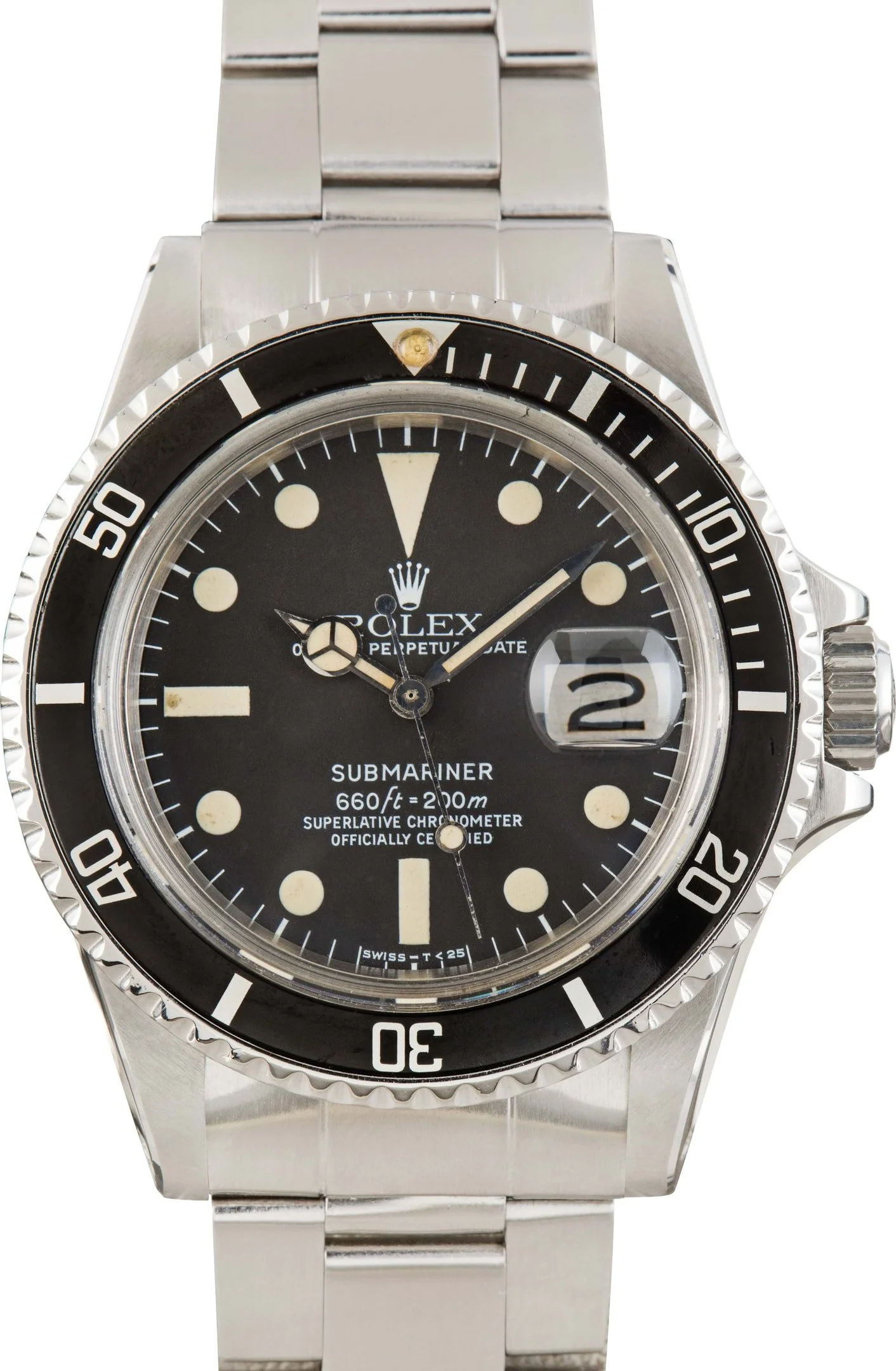 Why We Love This Watch This vintage Rolex Submariner ref. 1680 “White Sub” represents a transitional moment in Submariner history and remains a cornerstone reference for vintage Rolex enthusiasts. Its 40mm stainless steel case and matching Oyster bracelet retain the tool-watch integrity collectors prize, while the clean white-print tritium dial—free from the earlier red-text variant—offers an aesthetic prized for its balanced, understated execution. With its tritium lume aging to a warm patina, intact date window with Cyclops magnifier. WATCH DETAILS CREDIT CARD PRICE $11,313.86 BRAND Rolex MODEL NAME Submariner MODEL NUMBER 1680 YEAR Circa 1978 ITEM NUMBER 184059 CONDITION Vintage GENDER Mens BOX & PAPERS No Box or Papers CASE MATERIAL Stainless Steel CRYSTAL Acrylic SIZE 40MM BEZEL Aluminum Timing CASEBACK Solid SERIAL 5406XXX DIAL Black w/ Tritium hour markers, Tritium hands & Tritium lume MOVEMENT CALIBRE 1570 TYPE Automatic BEZEL Bidirectional COMPLICATION Date BRACELET MATERIAL Stainless Steel TYPE Oyster CLASP Fliplock