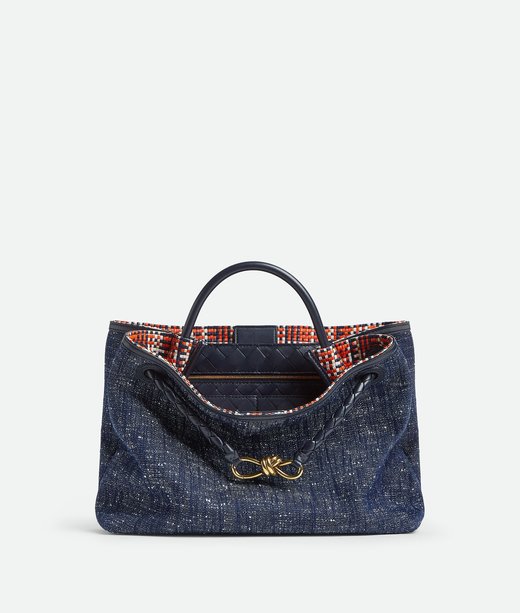 Top handle bag in denim boucle with signature knot detail and sliding cross-body Product Details - Denim boucle top-handle bag with sliding cross-body strap - Mini Intrecciato vichy lambskin lining - Compartmented interior with one zipped pocket, two open pockets - Magnetic closure - Material: Cotton, polyamide, lambskin - Lining: Lambskin - Color: Navy/White/Orange - Hardware: Brass finish - Height: 25 cm | 9.8" - Width: 35 cm | 13.8" - Depth: 11 cm | 4.3" - Handle drop: 9 cm | 3.5" - Strap drop: 45 cm | 17.7" - Made in: Italy - Product code: 836381V52M38876