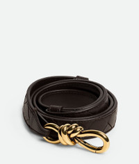 Belt in Intrecciato nappa leather with signature knot buckle. Product Details - Intrecciato leather belt - Metal knot buckle - Hook closure - Lining: Calfskin - Color: Fondant - Hardware: Muse Brass finish - Made in: Italy - Product code: 855245VCPP52190 Material - Material: Lambskin Size & Fit - Height: 2 cm (0.8") - Depth: 0.5 cm (0.2")