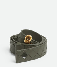 Belt in Intrecciato nappa leather with signature knot buckle. Product Details - Intrecciato leather belt - Metal knot buckle - Pin closure - Adjustment system on the back - Lining: Calfskin - Color: Pickle - Hardware: Muse Brass finish - Made in: Italy - Product code: 806097VCPP53293 Material - Material: Lambskin Size & Fit - Height: 3 cm (1.2") - Depth: 0.5 cm (0.2")