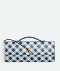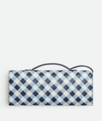 Top handle clutch in tri-colour Intrecciato leather with vichy pattern and signature Product Details - Intrecciato vichy leather top handle clutch with metallic knot closure - Six card slots, one additional pocket - Material: Lambskin - Lining: Lambskin - Color: Abyss/Ice/White - Hardware: Brass finish - Height: 13 cm | 5.1" - Width: 31 cm | 12.2" - Depth: 3 cm | 1.2" - Handle drop: 2 cm | 0.8" - Made in: Italy - Product code: 741511V5QI04154 Size & Fit - Fits iPhone 16 Pro Max, a credit card case, airpods and keys.
