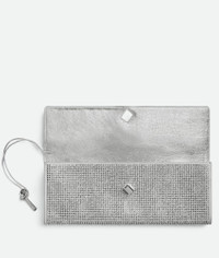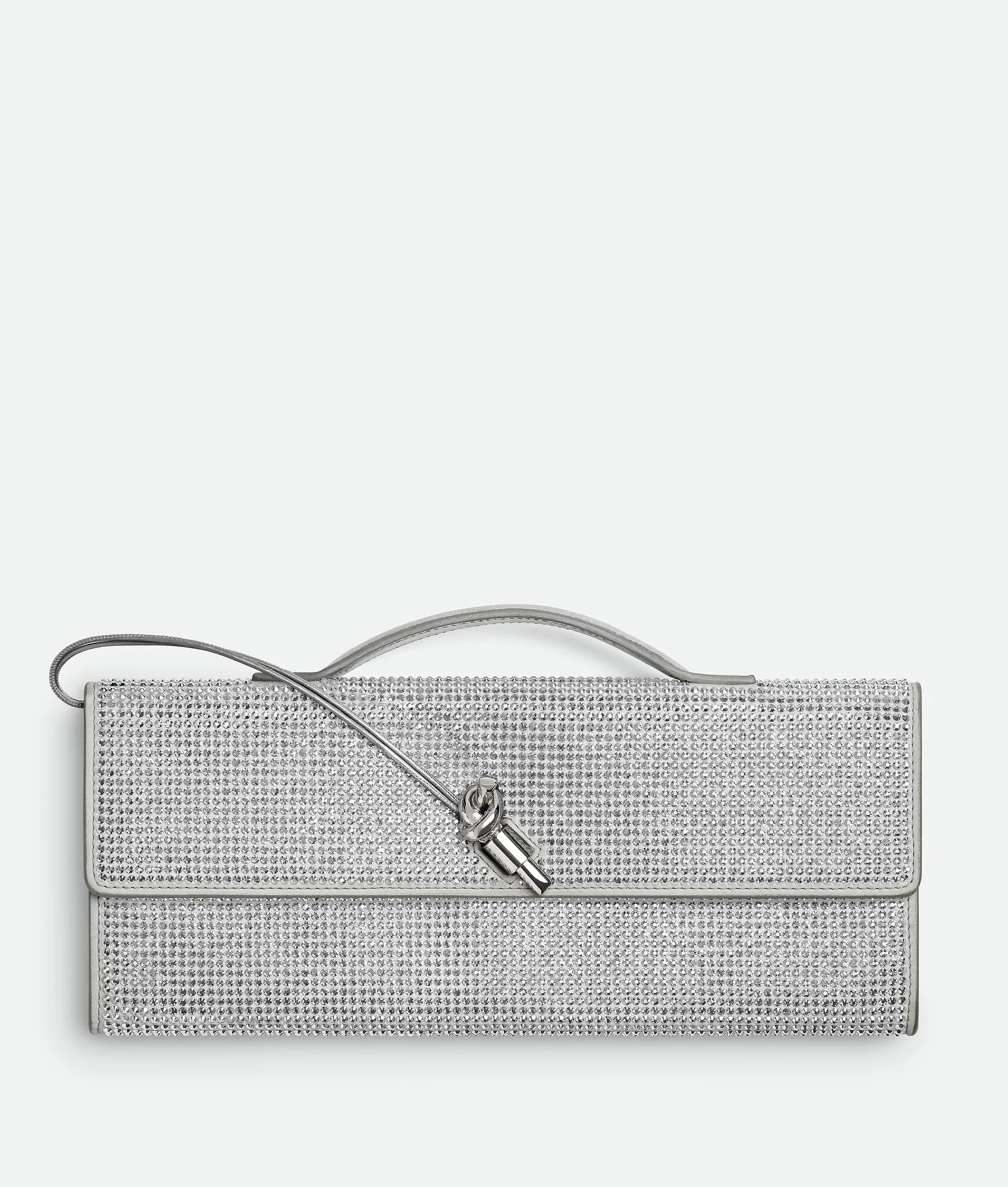 Product Details - Crystal leather top handle clutch with metallic knot closure - Six card slots, one additional pocket - Lining: Lambskin - Color: White moonlight/Silver - Hardware: Silver finish - Made in: Italy - Product code: 844124V4T141905 Material - Material: Goat leather Size & Fit - Height: 13 cm (5.1") - Width: 31 cm (12.2") - Depth: 3 cm (1.2") - Handle drop: 2 cm (0.8") - Fits iPhone 16 Pro Max, a credit card case, airpods and keys.