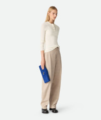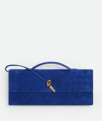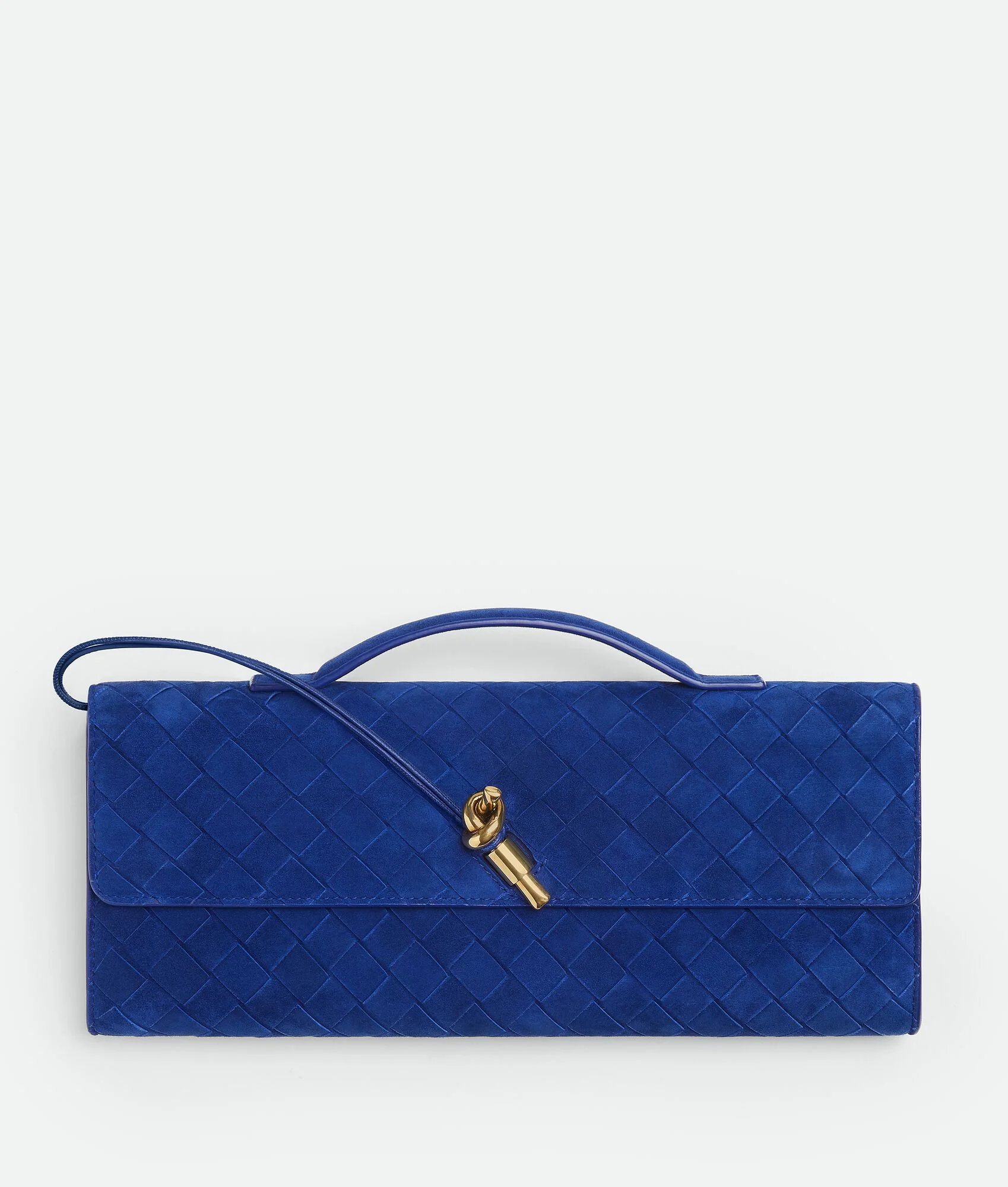 Top handle clutch in Intrecciato suede with signature knot closure. Product Details - Intrecciato suede leather top handle clutch with metallic knot closure - Six card slots, one additional pocket - Lining: Lambskin - Color: Blue royal - Hardware: Brass finish - Made in: Italy - Product code: 741511V60F14300 Material - Material: Calfskin Size & Fit - Height: 13 cm (5.1") - Width: 31 cm (12.2") - Depth: 3 cm (1.2") - Handle drop: 2 cm (0.8") - Fits iPhone 16 Pro Max, a credit card case, airpods and keys.