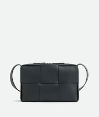 Camera bag in Intreccio leather with adjustable strap. Product Details - Intreccio leather camera bag with adjustable strap - One interior zipped pocket - Zipper closure - Material: Calfskin - Lining: Unlined - Color: Ardoise - Hardware: Silver finish - Height: 18 cm | 7.1" - Width: 28 cm | 11" - Depth: 9 cm | 3.5" - Strap drop: 50 cm | 19.7" - Made in: Italy - Product code: 731165V56A12077